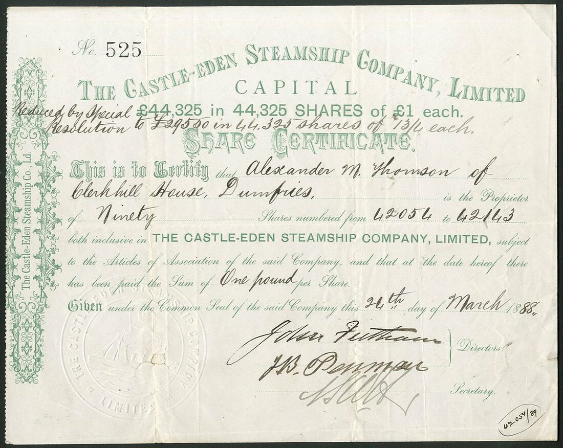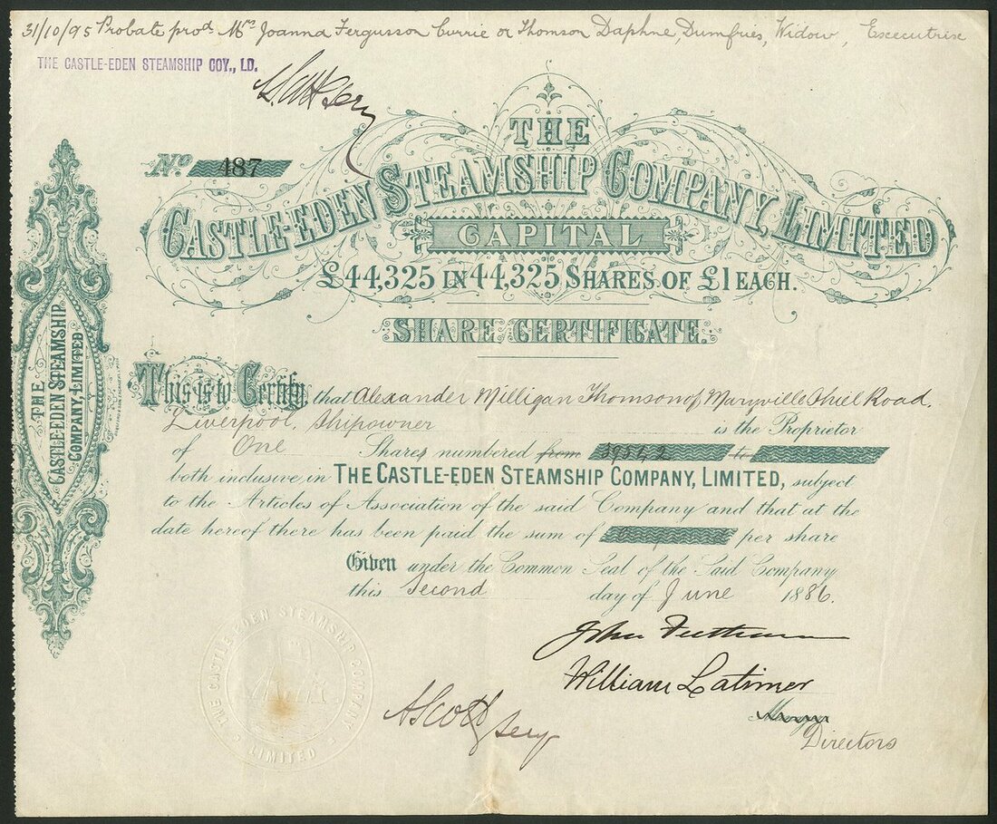 Great Britain: Castle-Eden Steamship Company Ltd., pair of certificates for £1 shares, the first part paid, 18[86], #487, decorative green printing, together with a smaller format piece, 18[88], #525, green. Built in Liverpool in 1882, 2381 gross tons. Capital reduced in 1887. Seemed to be plagued by financial problems along with its sister companies Castle Hill and Castle Dale which had already been sold. Liquidated around 1896. A couple of small tone spots on the first, the second repaired on reverse, VF and AVF. (2)