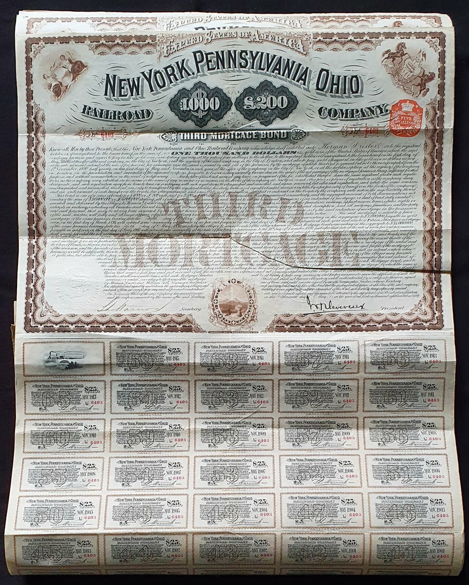 U.S.A.: New York, Pennsylvania and Ohio Railroad Co., a group of 9 x 3rd Mortgage Bonds for $1000 or £200 (6) and $500 or £100 (3), 1880, brown and black, with coupons VF, some better and NOT cancelled (9).