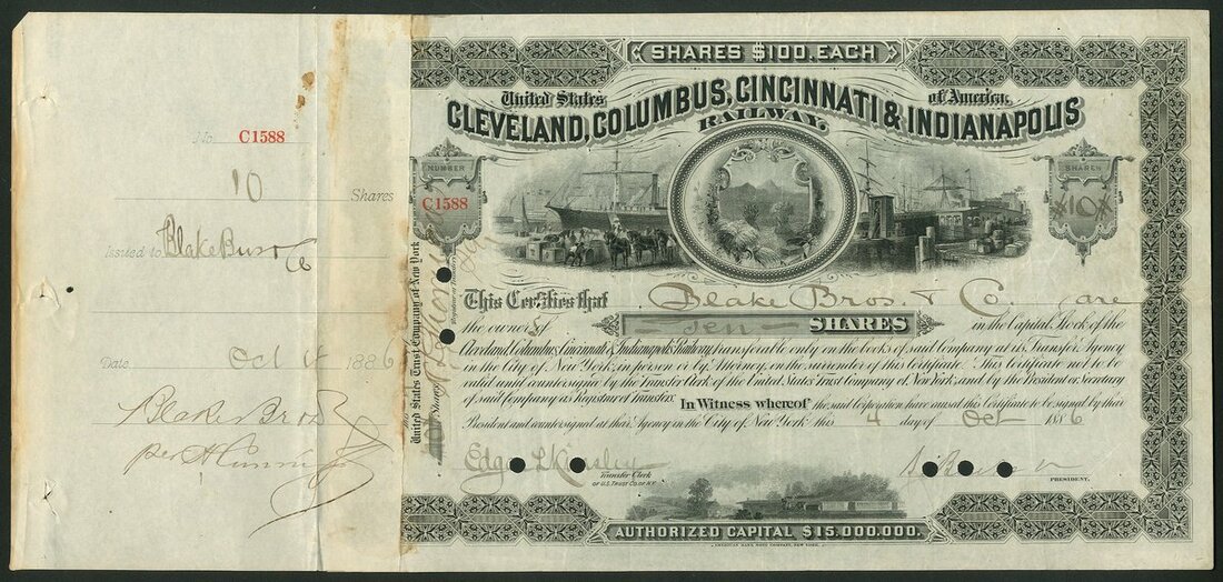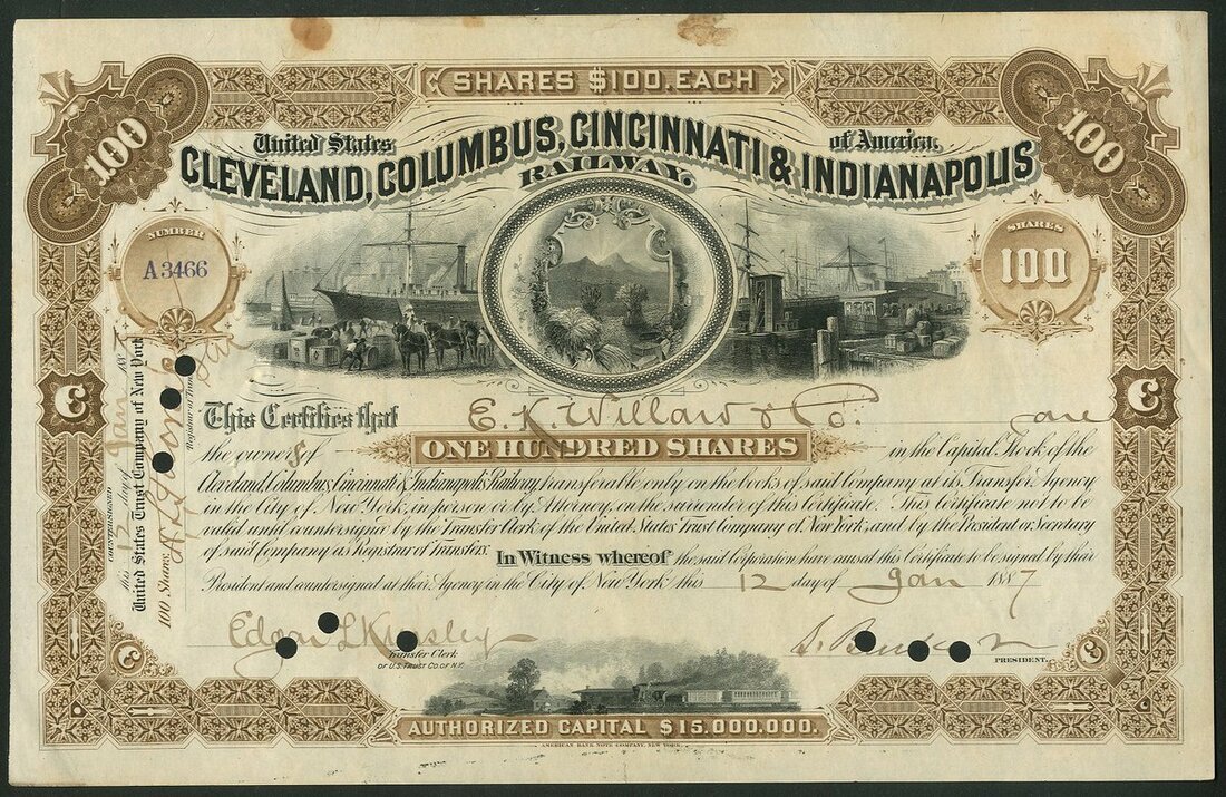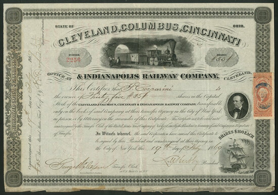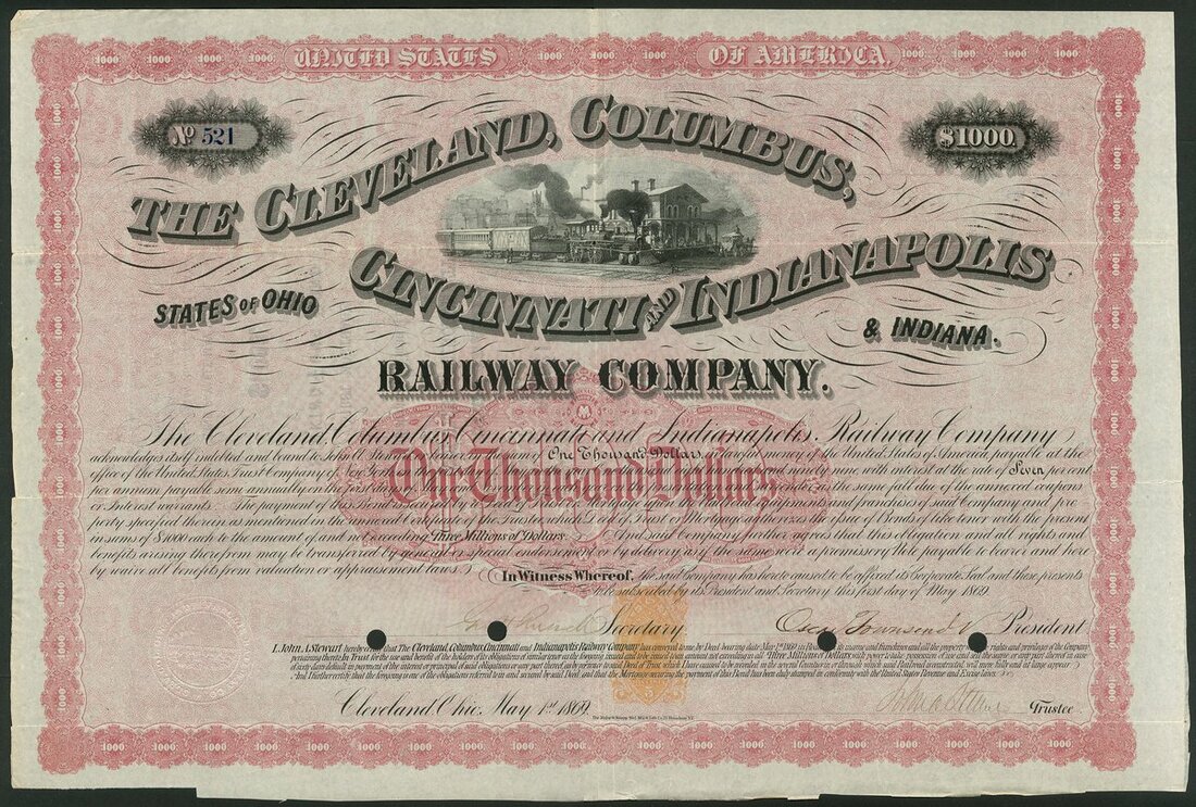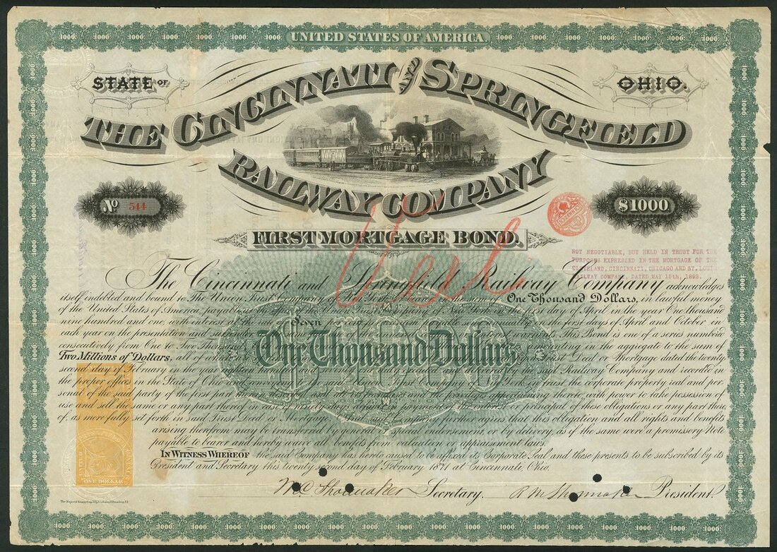 (x) U.S.A.: Ohio and Indiana Railroads; a collection of certificates including Cleveland, Columbus, Cincinnati and Indianapolis Railway Co., $1000 bond, 1869, #521; Cincinnati and Springfield Railway Co., 1st Mortgage bond, $1000, 1871, #544; Cincinnati Railway Tunnel Co., preferred stock, 18[72], #131, and other certificates (7), all illustrated here. Most are cancelled, mixed condition, F-VF (10).