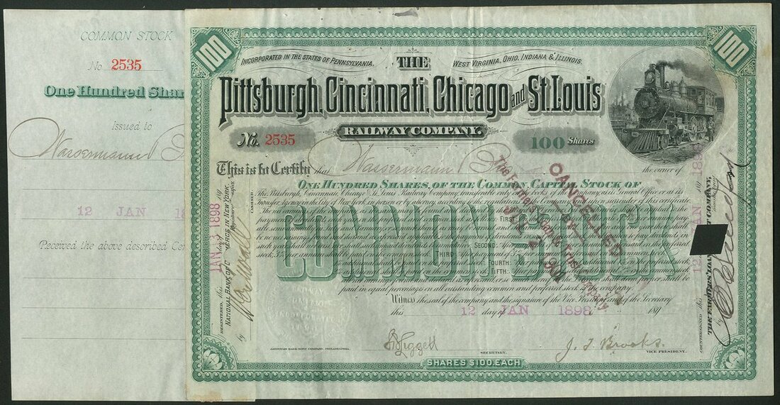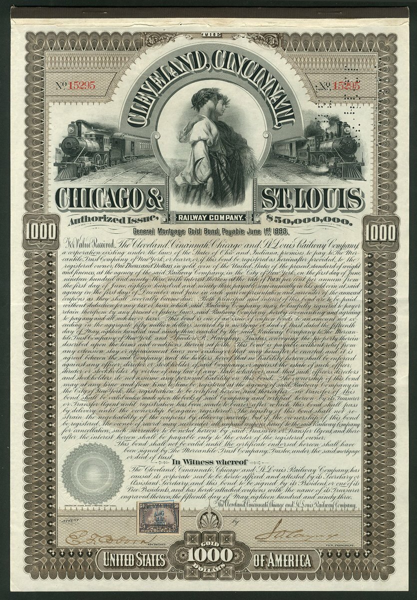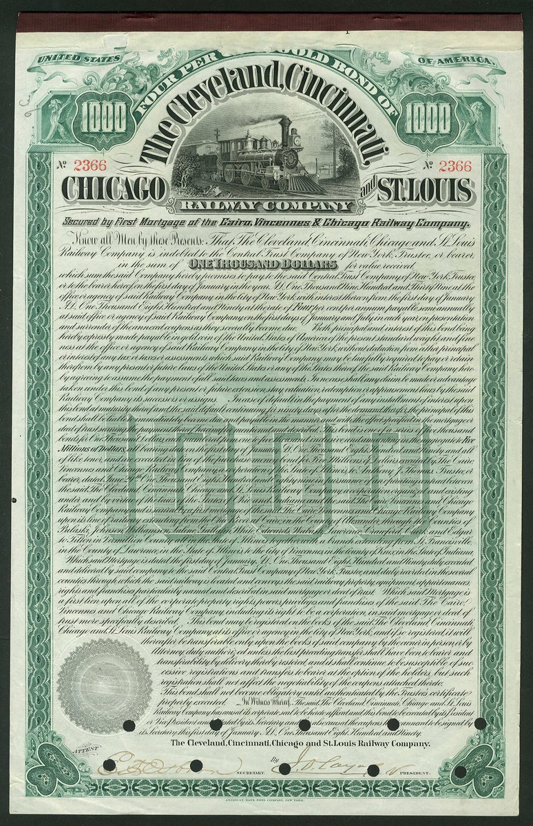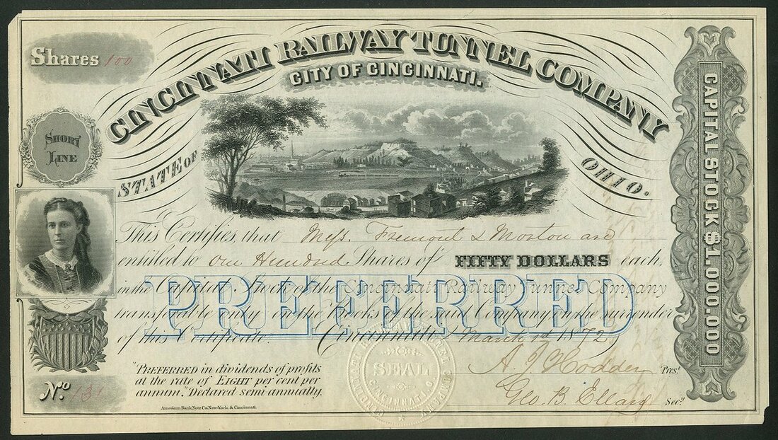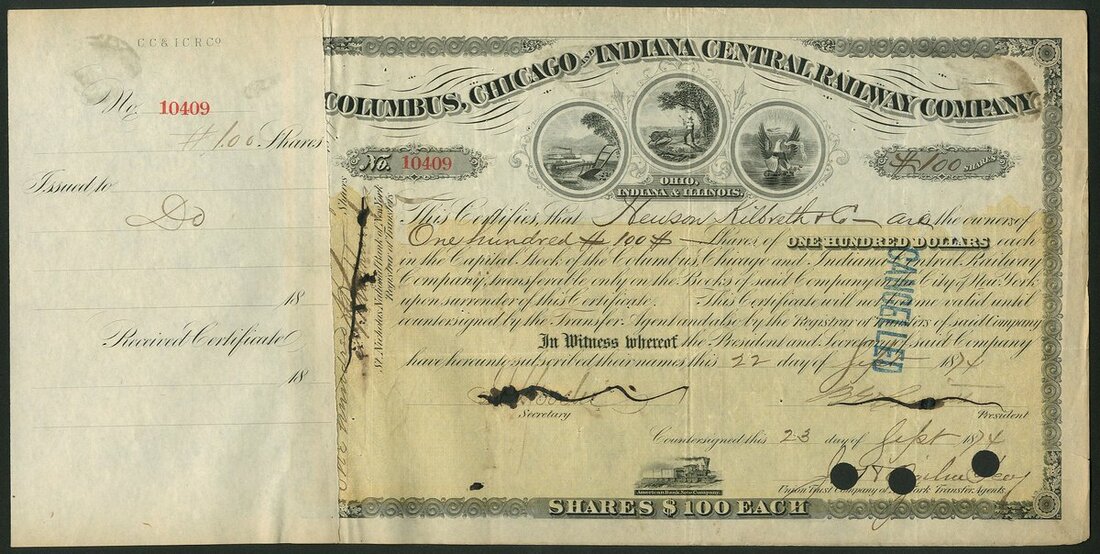 (x) U.S.A.: Ohio and Indiana Railroads; a collection of certificates including Cleveland, Columbus, Cincinnati and Indianapolis Railway Co., $1000 bond, 1869, #521; Cincinnati and Springfield Railway Co., 1st Mortgage bond, $1000, 1871, #544; Cincinnati Railway Tunnel Co., preferred stock, 18[72], #131, and other certificates (7), all illustrated here. Most are cancelled, mixed condition, F-VF (10).