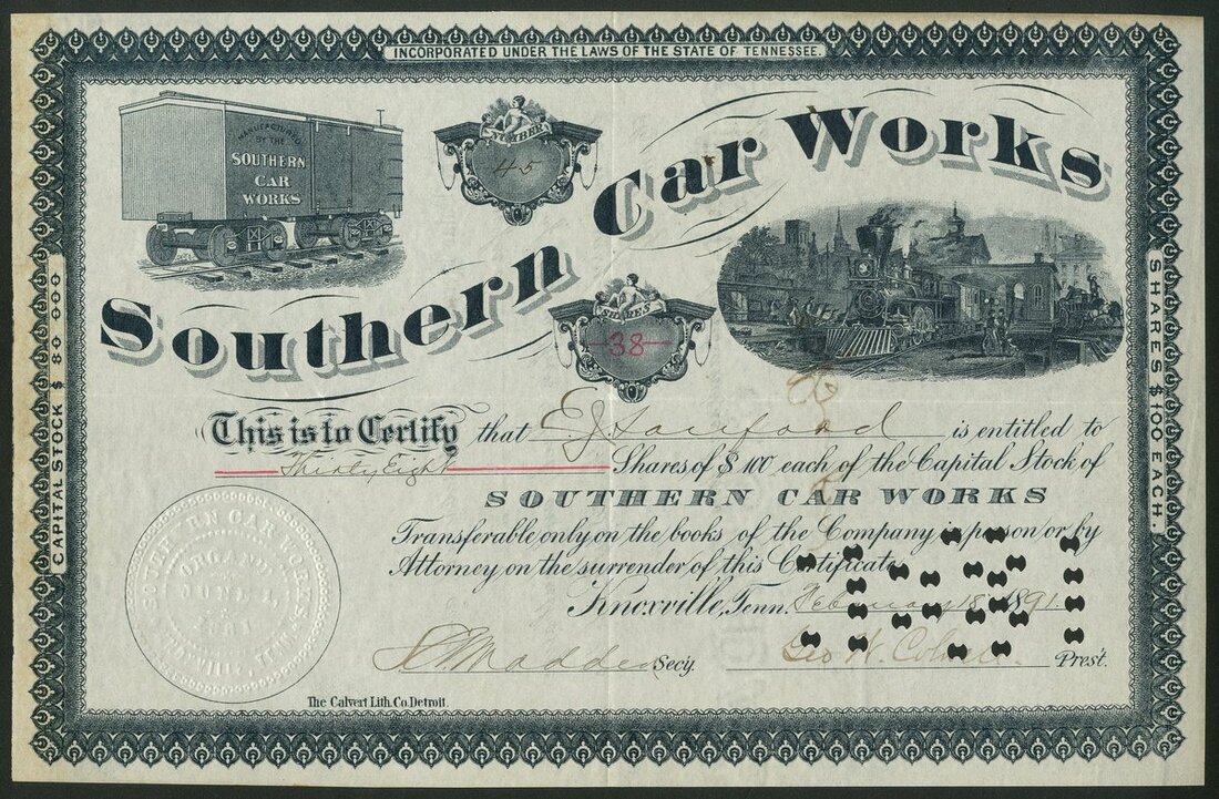 (x) U.S.A.: Southern Car Works, Tennessee, $100 shares, Knoxville 18[91], #45, 8 wheel railway wagon top left, steam train at right, black, The Calvert Lith Co. Detroit. Small hole cancels, glue residue at left, GVF.