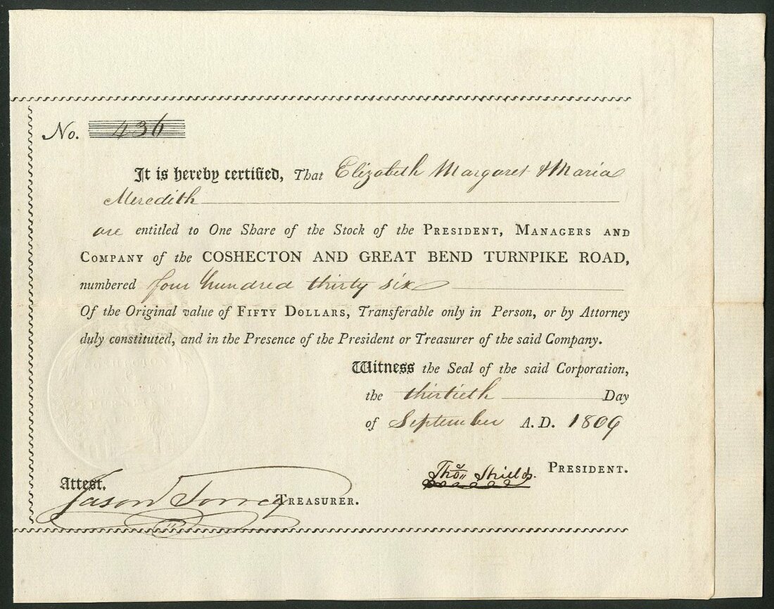 U.S.A: Coshecton and Great Bend Turnpike Road, one share, [1809], #436, small with black printing, embossed seal. EF.