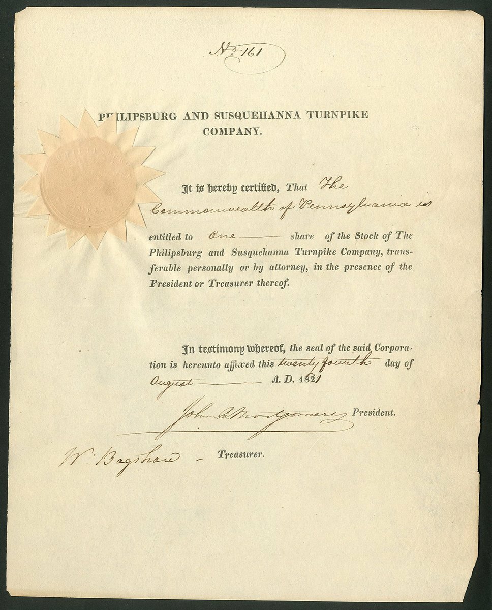 U.S.A: Philipsburg and Susquehanna Turnpike Co., one share, 182[1], #161, black printing, embossed seal top left. Incorporated in 1819 along with four other turnpike roads covering a route from Northumberland to the Susquehanna at Anderson's Creek. Brittle corners and right edge, VF.
