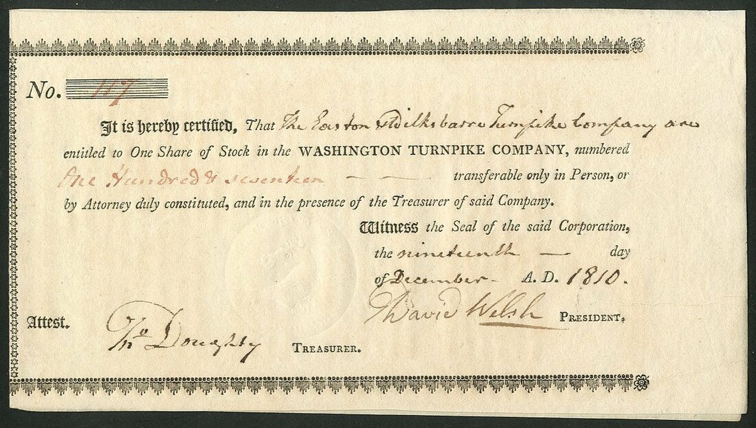 U.S.A: Washington Turnpike Co., one share, [1810], #117, small with black printing, faint embossed seal. Incorporated in New Jersey in 1809. EF.