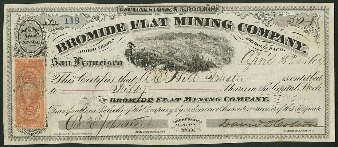 U.S.A.: Bromide Flat Mining Company, $100 shares, San Francisco 18[69], #118, mining area centre, black. White Pine District, Nevada. About EF.