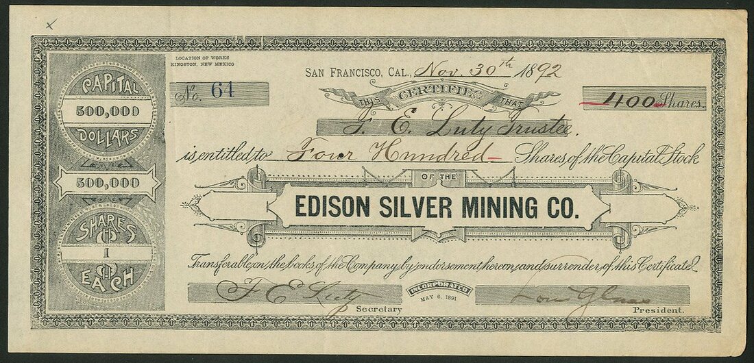 (x) U.S.A.: Edison Silver Mining Co. (CA), $1 shares, San Francisco 18[92], #64, black printing, works at Kingston, New Mexico. VF.