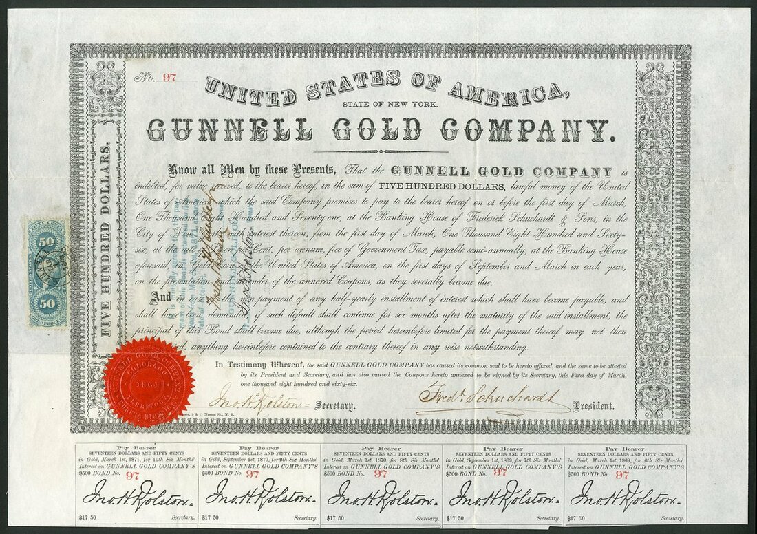 USA: Gunnell Gold Company (NY), 7% bond for $500, 1866, #97, ornate border, black, scarce blue 50c adhesive revenue stamp, with coupons. Mines near Central City, Gilpin County, Colorado. VF.