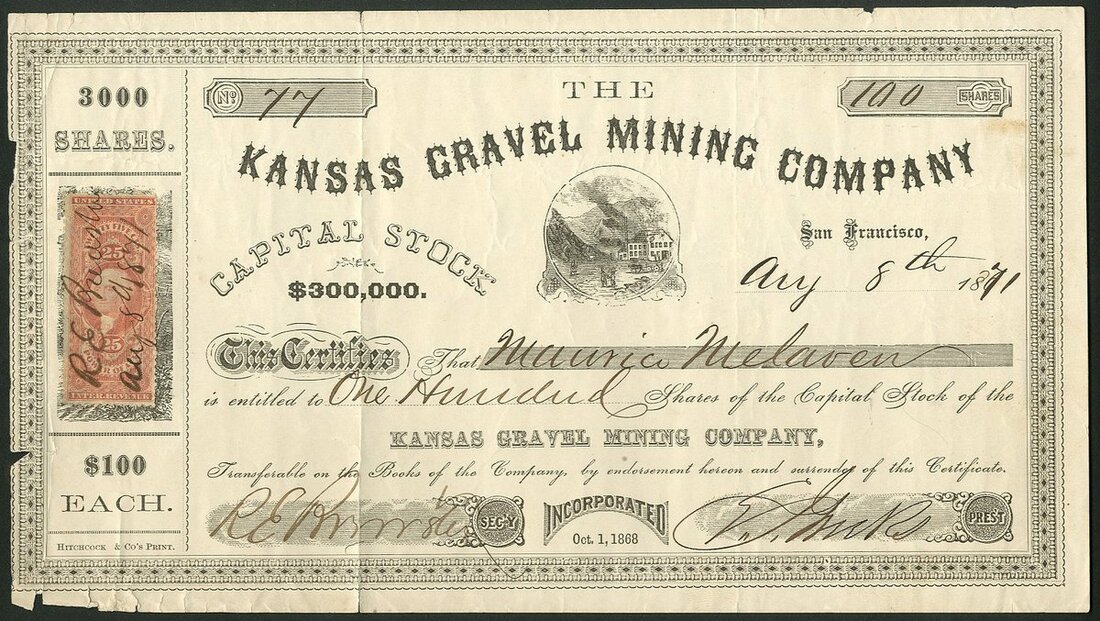 U.S.A: Kansas Gravel Mining Co., $100 shares, 186[71], #77, small vignette of mine site below title, ornate border, black. Incorporated in 1868 to acquire mines in California. Large split bottom left, other smaller tears. Only Fine.