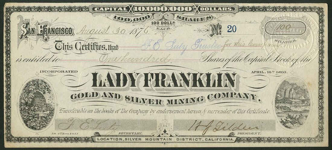 U.S.A.: Lady Franklin Gold and Silver Mining Co., $100 shares, San Francisco 187[6], #20, mine buildings at right, beehive left, black on cream paper. Mines in the Silver Mountain District, California. NEF.