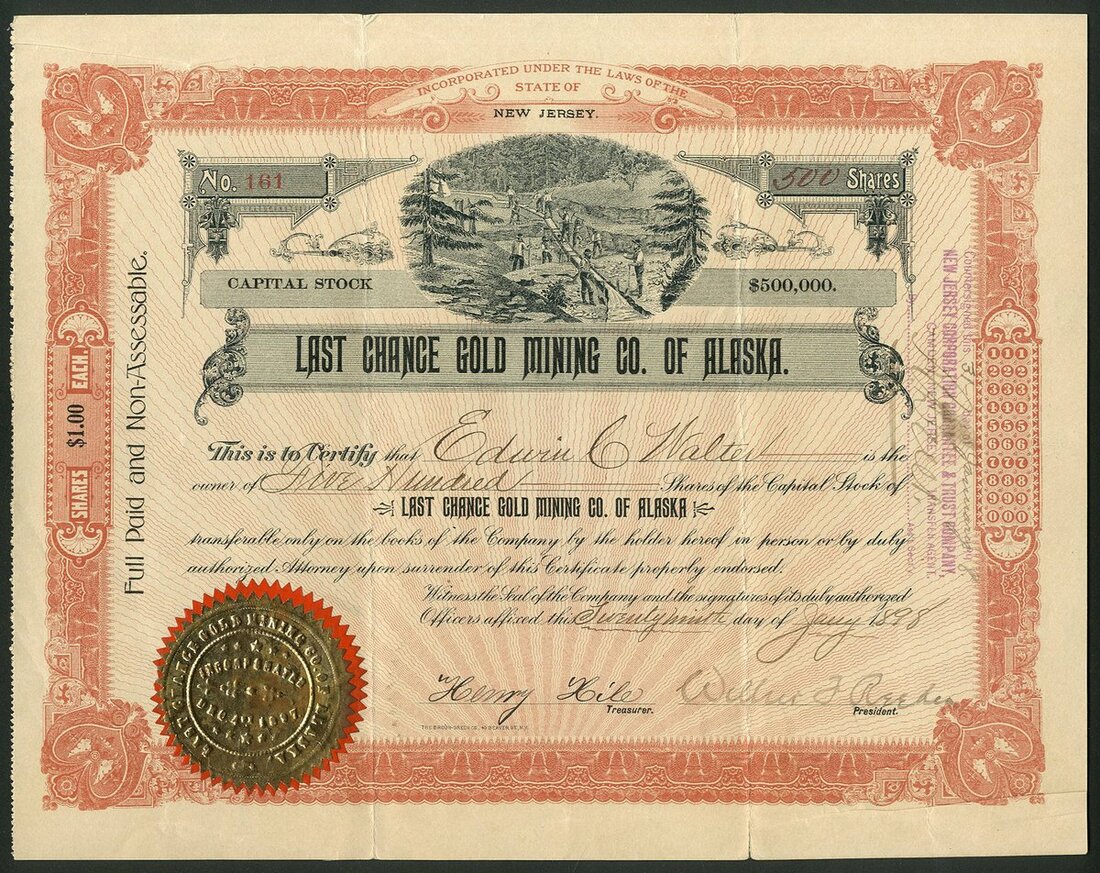 U.S.A: Last Chance Gold Mining Co. of Alaska, $1 shares, 1[898], #161, gold panning scene above title, ornate border, red and black, gold seal. A New Jersey incorporation with offices in Philadelphia and works near Juneau, Alaska. Small edge tears on folds, VF.