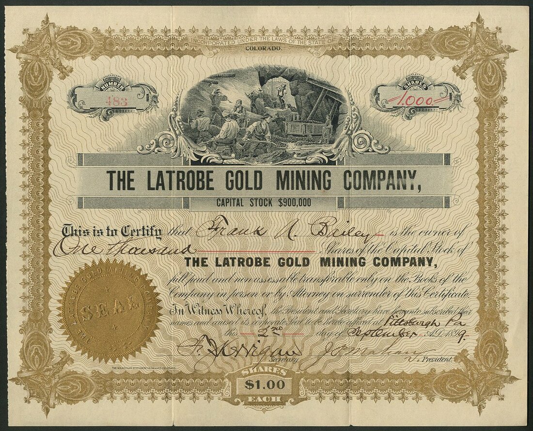 U.S.A: Latrobe Gold Mining Co., $1 shares, 189[9], #483, vignette depicting busy mineshaft above title, ornate border, gold and black. Owned the Pittsburg claim on Straub Mountain, Cripple Creek, Colorado. VF.