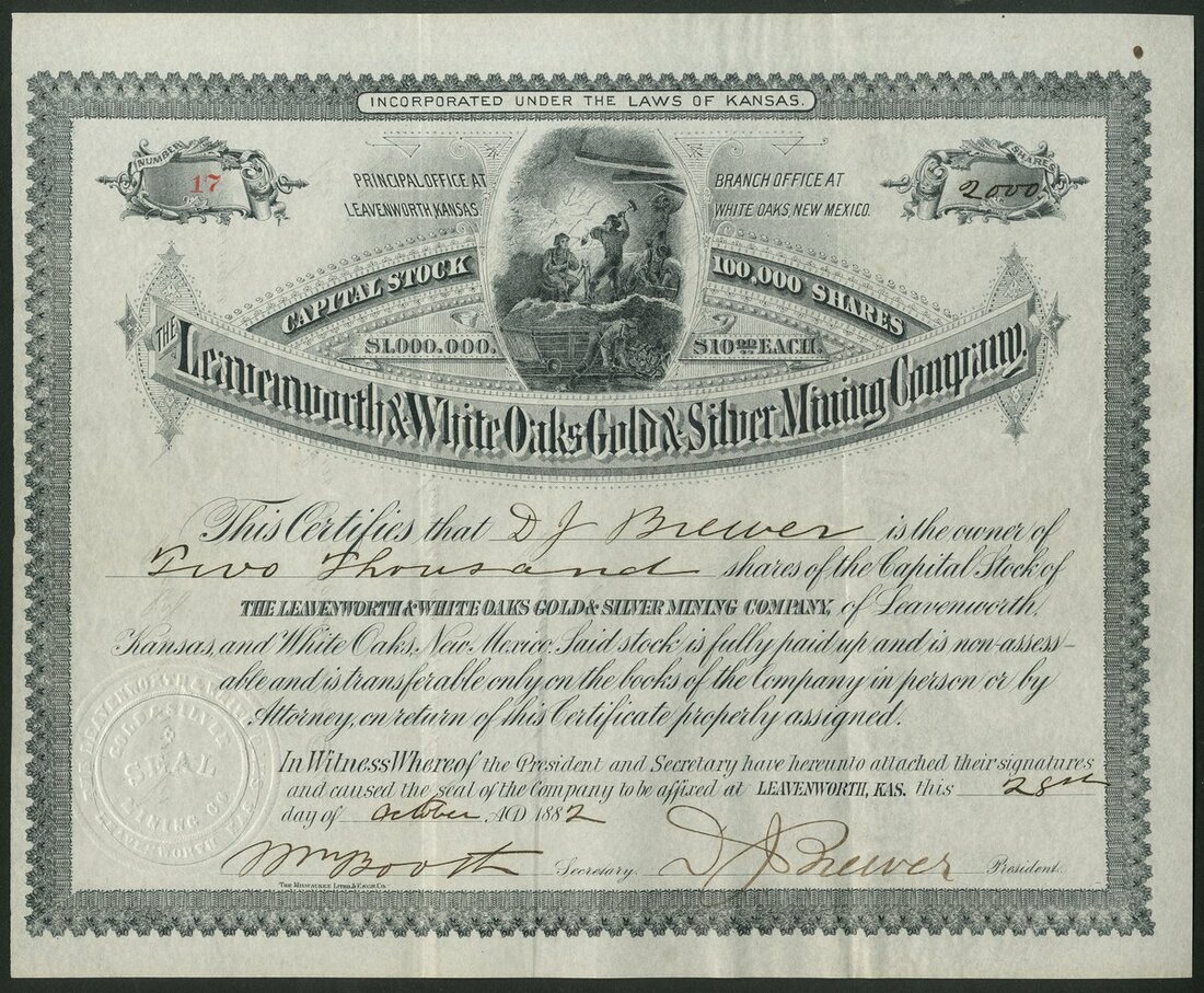 (x) U.S.A.: Leavenworth & White Oaks Gold & Silver Mining Company, $10 shares, Leavenworth 188[2], #17, miners top centre, black, Milwaukee Litho & Engr. Co. Owned the Badger Boy, Silver Glance and other mines in White Oaks, New Mexico. GVF.