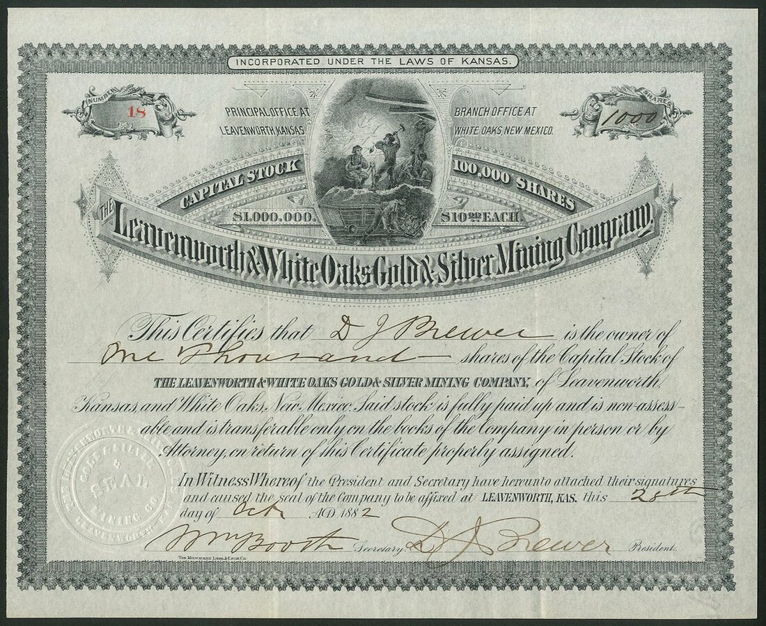 U.S.A: Leavenworth & White Oaks Gold & Silver Mining Co., $10 shares, 188[2], #18, miners at top, ornate border, black. A Kansas Corporation owning property at White Oaks, New Mexico. GVF.