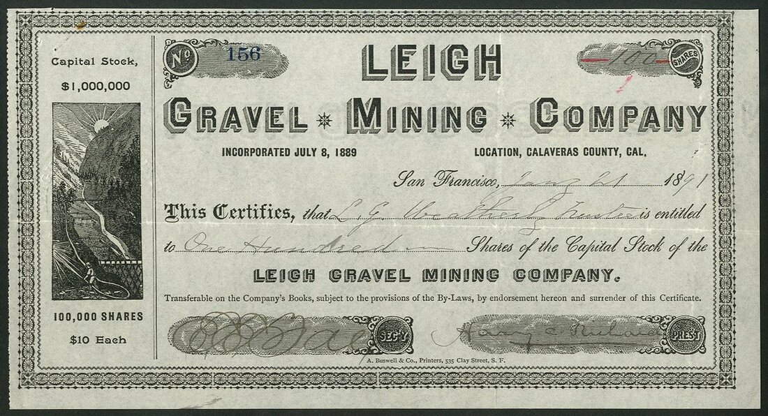 U.S.A: Leigh Gravel Mining Co., $10 shares, San Francisco 18[91], #156, small vignette of blasting on hillside, black. Incorporated 8th July 1889. Property in Calaveras County, California. GVF.