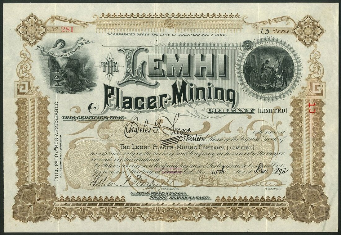 U.S.A: Lemhi Placer Mining Co. Ltd., $1 shares, 1[892], #281, decorative piece with miners top right and female figure top left, brown and black. Incorporated in Colorado in 1892. Mines in Lemhi County, Idaho. VF.