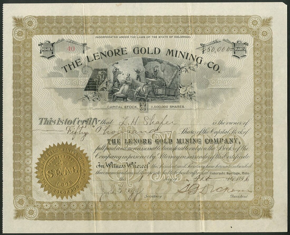 U.S.A: Lenore Gold Mining Co., $1 shares, 189[6], #40, miners working below title, ornate border, black and gold. Colorado. Not in Hills, Company based in Colorado Springs. Top right corner tip missing, VF.