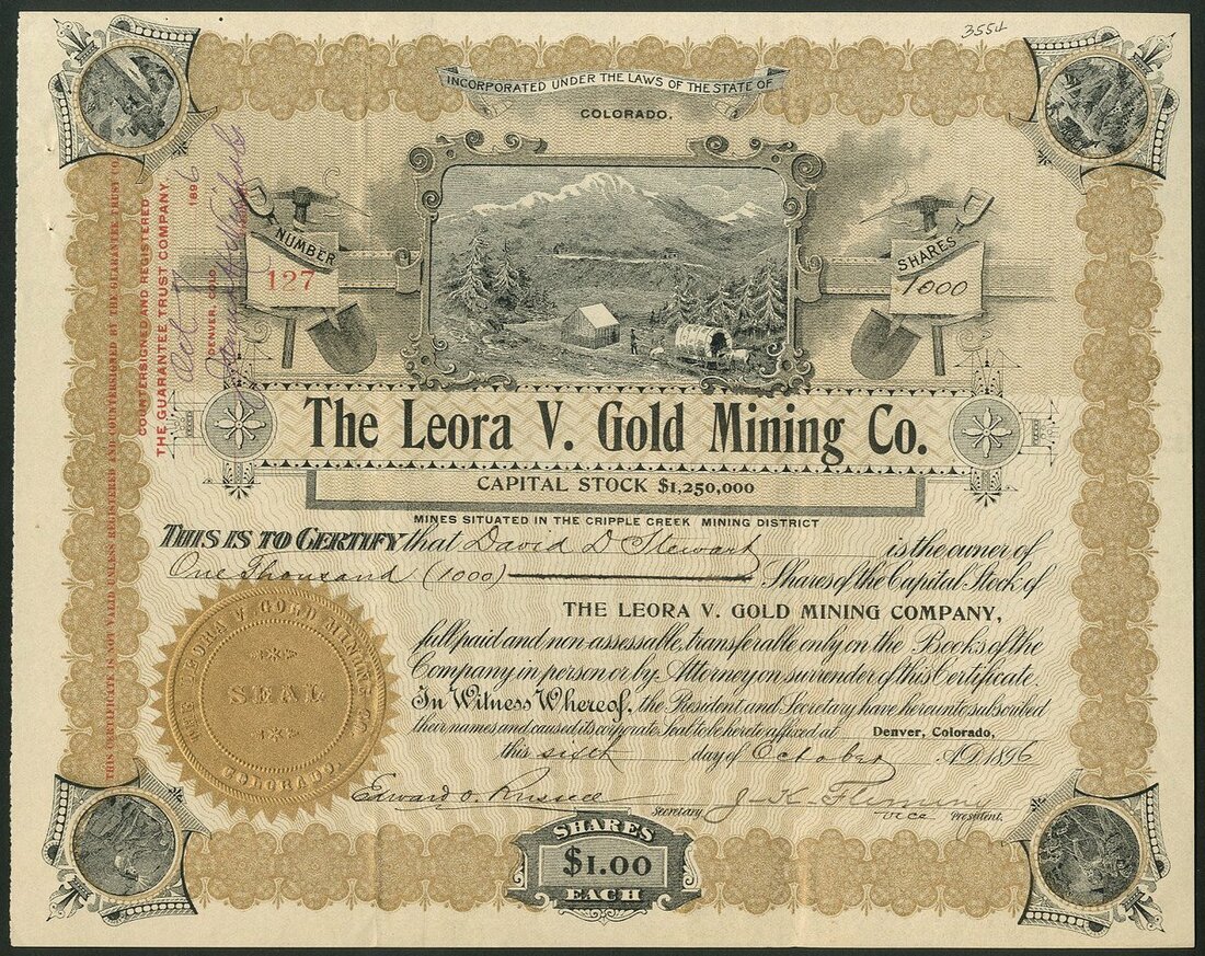 U.S.A: Leora V. Gold Mining Co., $1 shares, 189[6], #127, ornate piece with vignette of mine site at top and ornate border, smaller vignettes in corners, black and gold. Property in the Cripple Creek mining district, Colorado. GVF.