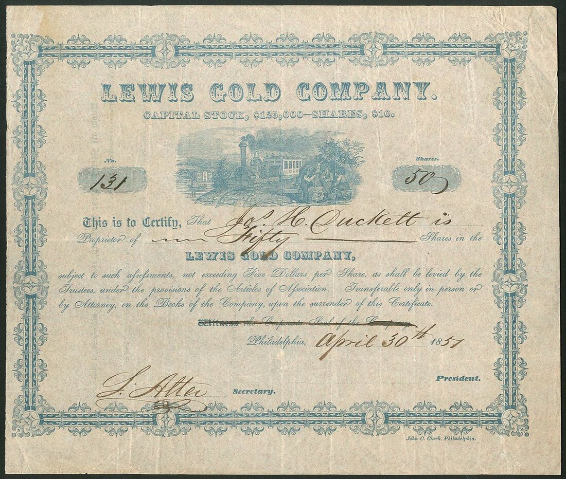 U.S.A: Lewis Gold Co., $10 shares, Philadelphia 18[51], #131, steam train approaching miners at top, ornate border, blue. Incorporated in February 1851 in North Carolina to operate property at Dahlonga, Georgia. Name changed to Lewis Gold Mining Comany. Small split at fold at top, VF.