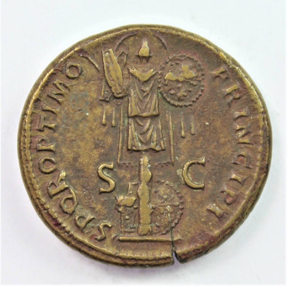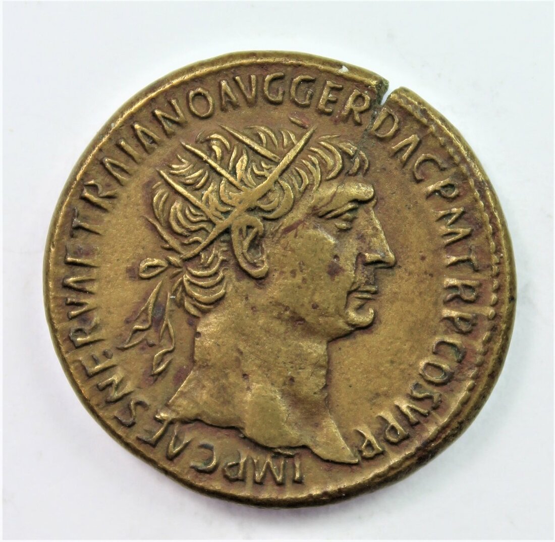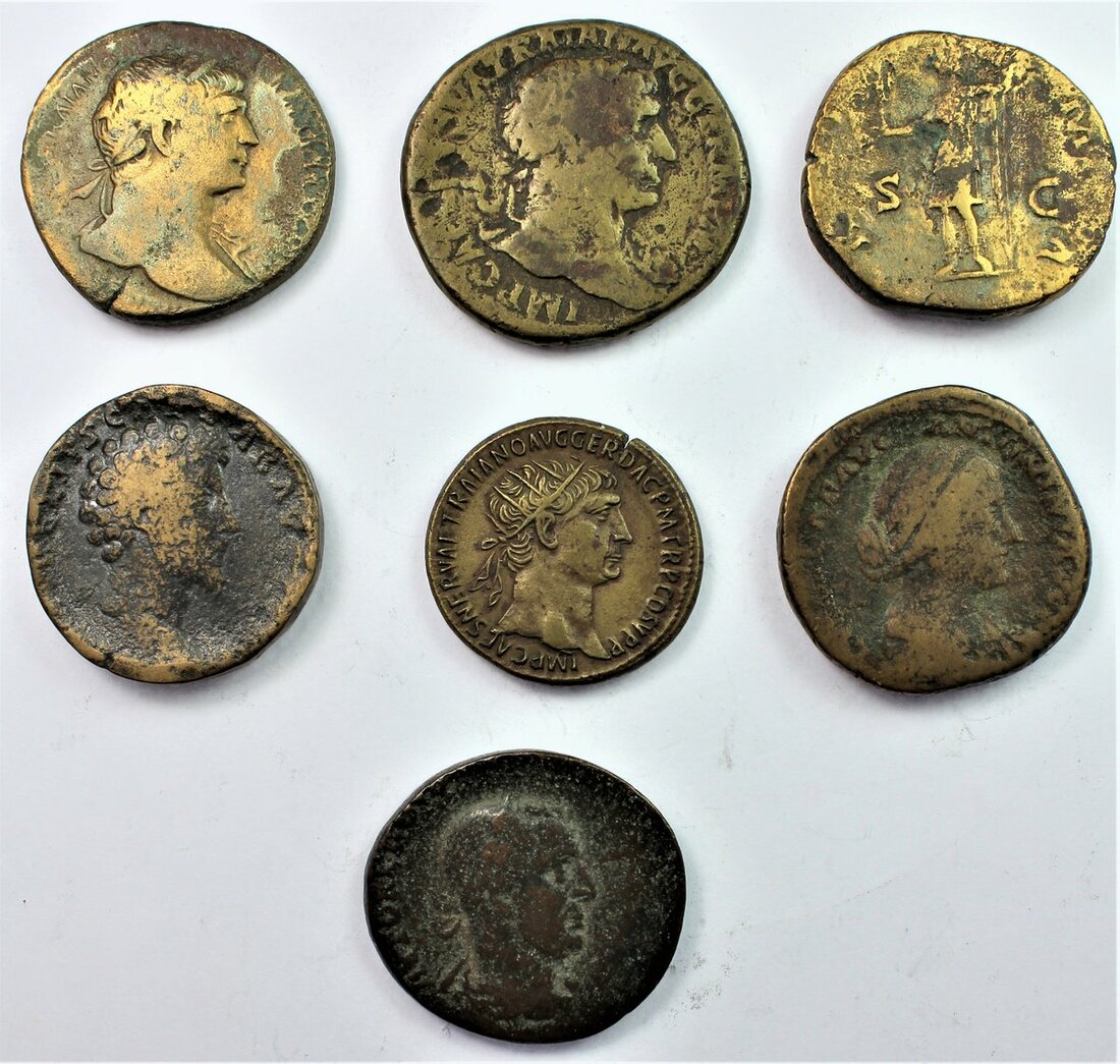 Roman Empire, First and Second Brass, Rome [6]; including, Trajan (AD 98-117) {3}, 23.67g; another, 20.71g; lastly, Dupondius, c. AD 105-111, 12.14g, rev. Trophies of War (Cohen 479var.; MIRE 14, 196b; RIC 586, Cohen 573, BMC 909), the last with a small striking crack, but well-centred, better than very fine; also, Hadrian (AD 117-38), Sestertius, 23.02g (Cohen 125); Marcus Aurelius (AD 161-80), Sestertius, 19.49g, TR POT XIIII..., Mars walking right; another, Lucilla, Sestertius, 25.11g (Cohen 84 [?]); lastly, Trajan Decius (AD 249-251), Provincial issue, Syria, Seleucis and Pieria, Antioch, 19.31g, rev. Temple (BMC Galatia, 222, 600-1), generally fair, an academic lot [7]