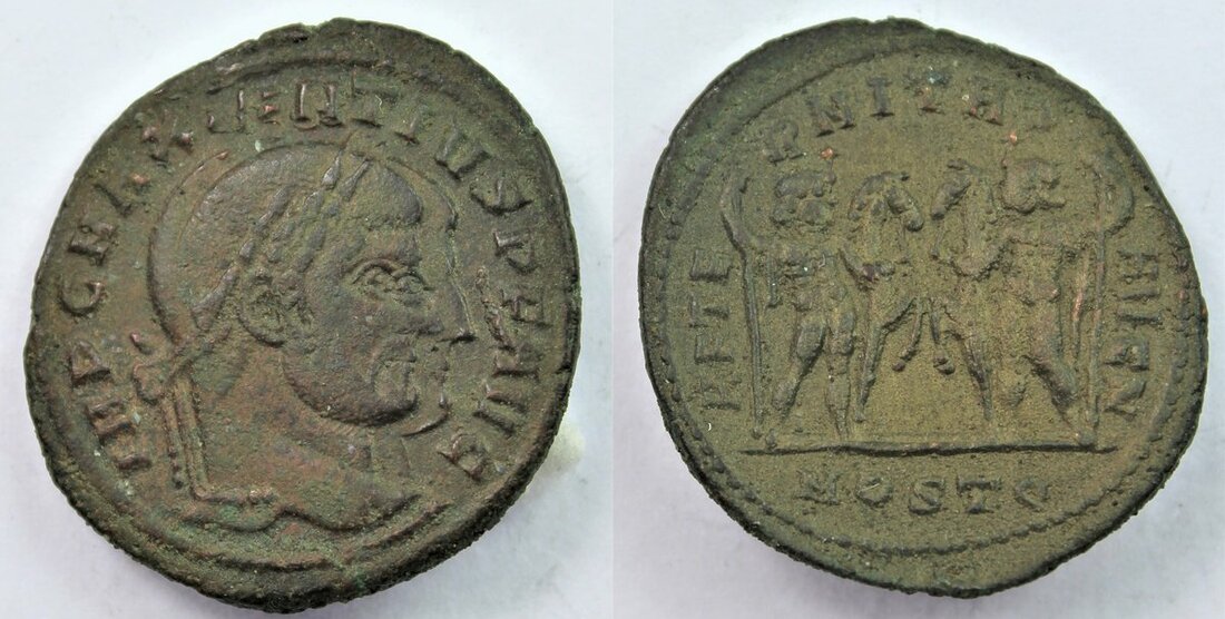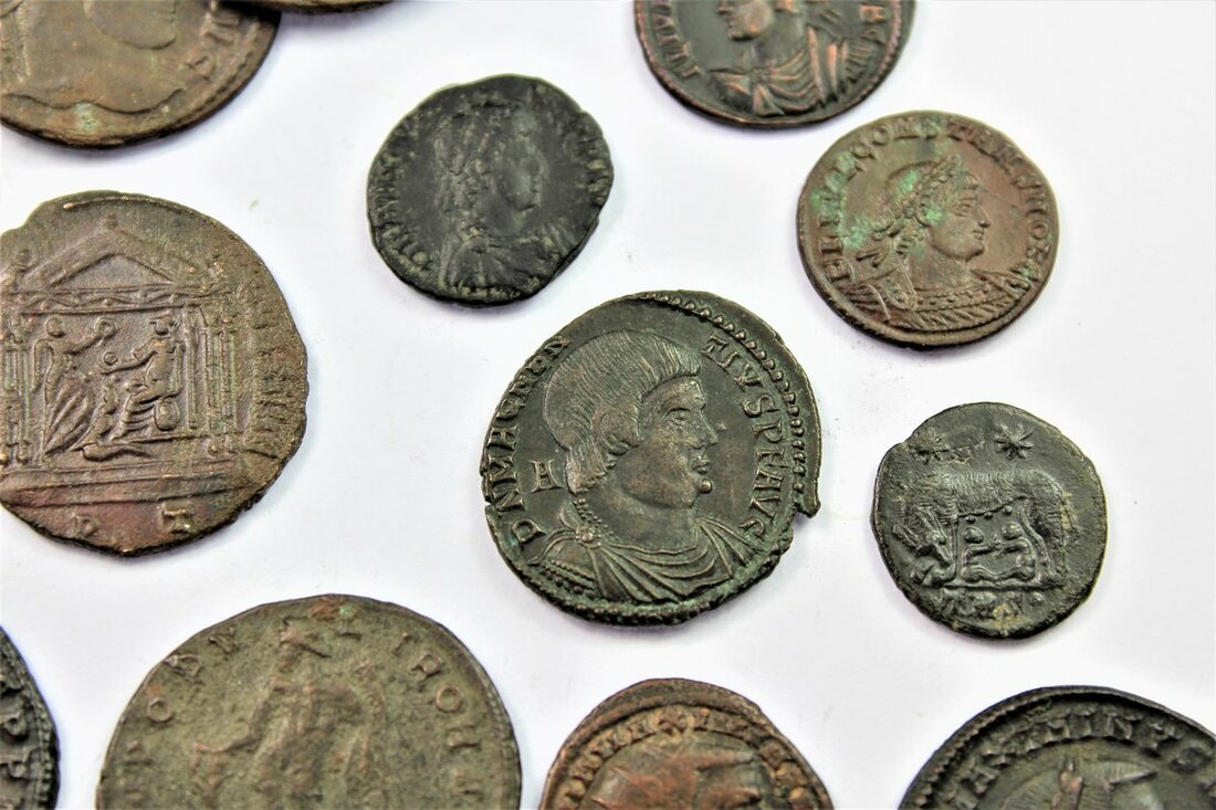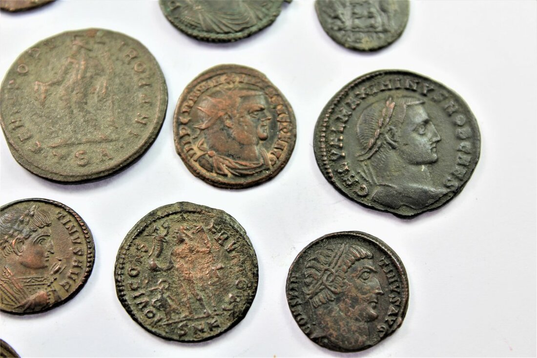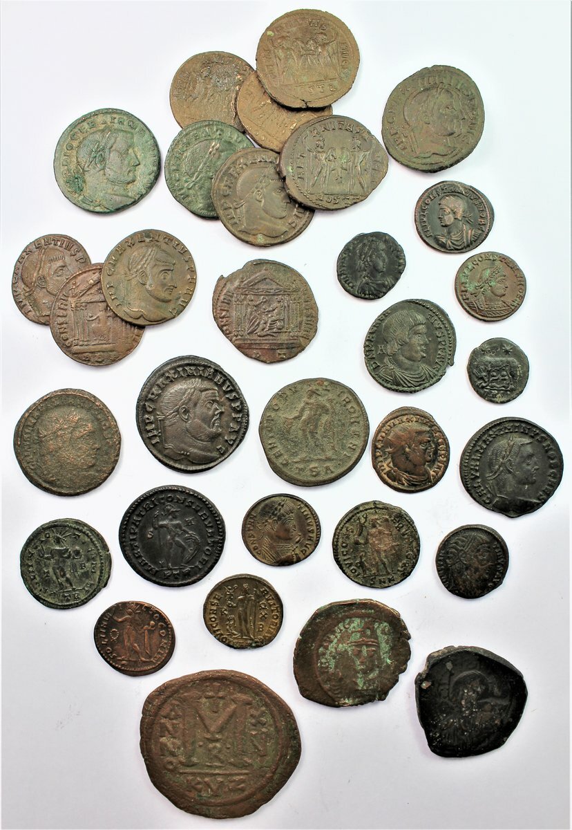 Roman Empire, 4th Century AD, AE Nummi coins [29] including, Diocletian, Follis, 9.96g, Treveri, GENIO POPVLI ROMANI (Cohen 94); Maxentius [11], including such types as: Ostia [7], AETERNITAS AVG, numerous officinae (RIC 35; Cohen 5), one noticeably double-struck; also, Rome, Temple types, Roma seated inset [3] (RIC 208; Cohen 21var.); lastly, Ticinum, similar rev. to last, chipped, otherwise about very fine; Galerius, 9.10g, Serdica (RIC 530B); also, Maximian Herculeus [3], Folles [2], 8.41g, SACRAMONIAE AVGG ET CAESS NN; another, GENIO POP ROMANI; another, Alexandria (Cohen 54, 185); Maximian II Daia, 6.08g, Heraclius (RIC 55; Cohen 53); also, Constantine the Great [6], Treveri [3], BEATA TRANQVILLITAS; another, a Follis, MARTI PATRI CONSERVATORI; another, SOLI INVICTO COMITI (RIC 15, 369, 869; Cohen 15, 345, 536); Cyzicus, 2.83g, IOVI CONSERVATORI (RIC 5 [R2]; Cohen 289); Antioch, Camp Gate type (RIC 504; Cohen 454); lastly, Rome, SOLI INVICTO COMITI (RIC 136 [R2]); additionally, Licinius I, AE3, Alexandria, c. 316-17, 3.49g (Cohen 72); Constantine II, as Caesar [2], Alexandria, GLORIA EXERCITVS, two standards; another, Siscia, Camp Gate type (RIC 88; 94 [R1]; Cohen -); Constantinopolis, c. 330 AD, Romulus and Remus suckling she-wolf (RIC 561; Cohen 18.2f); Magnentius (c. AD 350-53), Majorina, Lugdunum, 5.08g (RIC 130; Cohen 12); lastly, Arcadius, AE3/4, Antioch, VIRTVS EXERCITVS (RIC 60 [R3]), fair to good very fine, some scarce types; additionally, Post Roman Byzantium AE Folles [3], including, Justinian I, AN 19; Basil II and Constantine VII jointly; and another, largely illegible (BMC 246), these fair to fine [35]