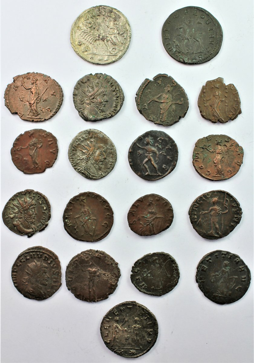 Gallic Empire, AE Antoninianii [12]; firstly, Victorinus (AD 269-271) [8], including such types as COMES AVG; PAX AVG; SALVS AVG; and PIETAS AVG (Cohen 36, 49.3; 79, 83, 90, 112 118); also, Tetricus I (AD 271-74), [4], including such types as: PRINC IVVENTVTI; LAETITIA AVGG; SALVS AVGG; and PAX AVG (Cohen 95); additionally, Official Imperial Issues [7], including, Claudius II Gothicus (AD 268-70) [3], including such types as: ANNONA AVG; IOVI STATORI; and VICTORIA AVG (Cohen 21, 124); Quintillus, brother of last (AD 270), 2.11g, Rome, LAETITIA AVG, XI in ex. (Cohen 39); lastly, Probus (AD 270-75), pre and post-Reform types [3], including: Equestrian issue, 3.36g, VIRTVS PROBI AVG; Siscia [2], Quadriga type, 3.35g, SOLI INVICTO; another, 4.05g, CLEMENTIA AVG (Cohen 87; 658; 928), the last with surviving silvering, otherwise generally very fine, a good assemblage [19]