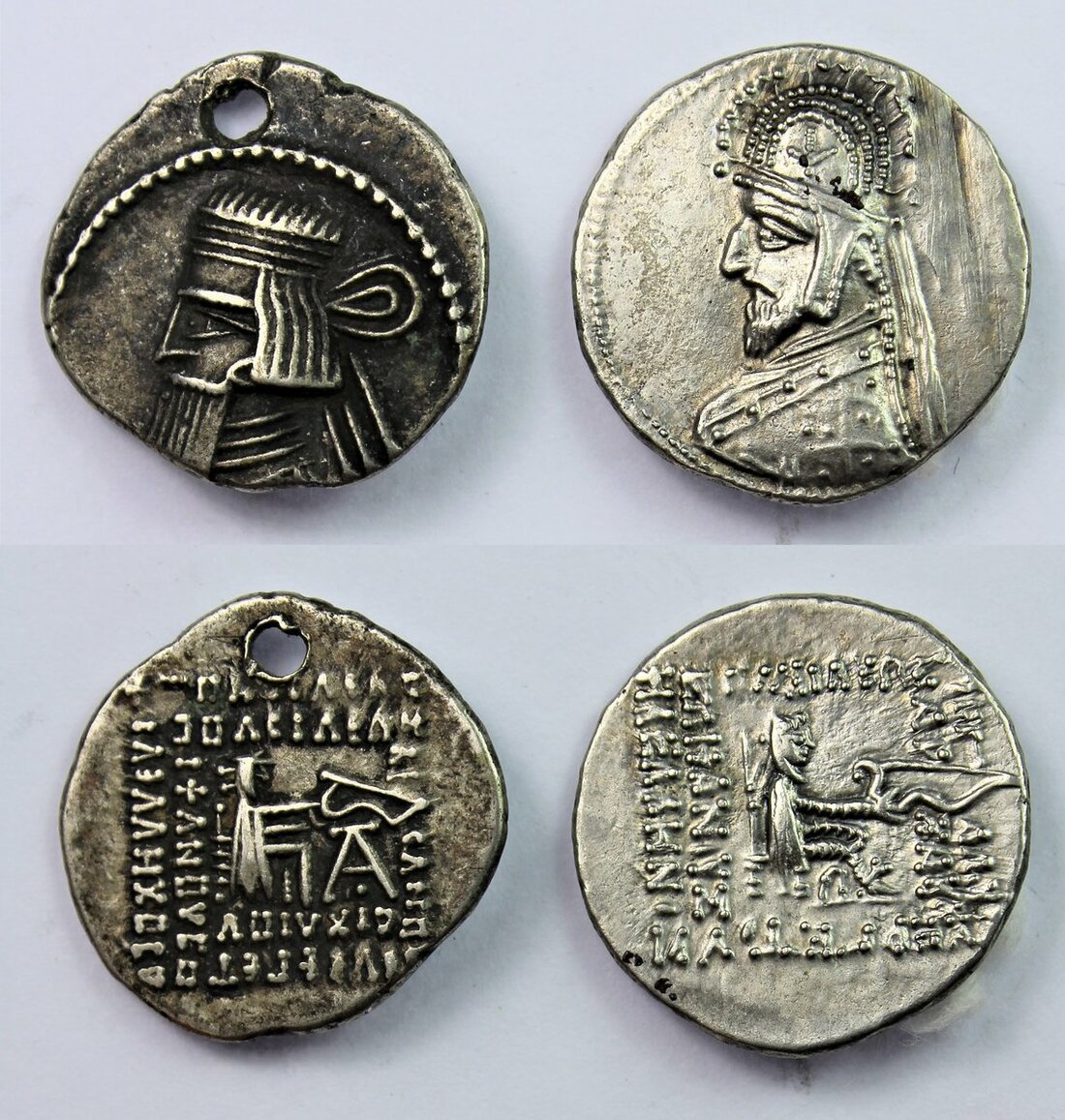 Parthian Kingdoms [2], including Phraates III (70-57 BC), AR Drachm, 3.94g, Susa (Pozzi 3114); very fine or near so; another; Artaban II (AD 10-38) (BMC 34; Gic 5776), pierced, otherwise about very fine [2]