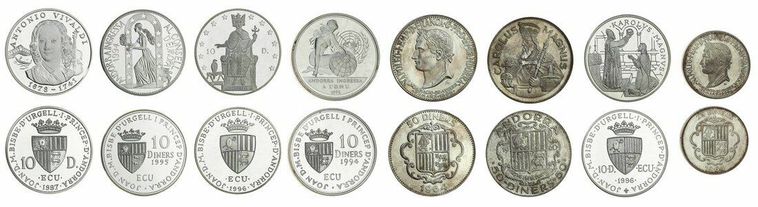 Andorra, Bishop Joan of Urgell, silver Proof Coins (8), including, 50-Diners [2], 1960, 'Charlemagne' (KM XM1; KM 121); another, 1964, 'Napoléon Bonaparte'; with 25-Diners, as last (KM XM4-XM5); also, 10-Diners {Ecu} [5], 1994, 'Andorra Ingressa' (KM 119); 1995, 'Andorra Ingress Al Consell d'Europa' (KM 108); also, 1996 [2], 'Frederic II'; another, 'Charlemagne'; lastly, 1997, 'Antonio Vivaldi' (KM 97; 121; 133), brilliant uncirculated (8)