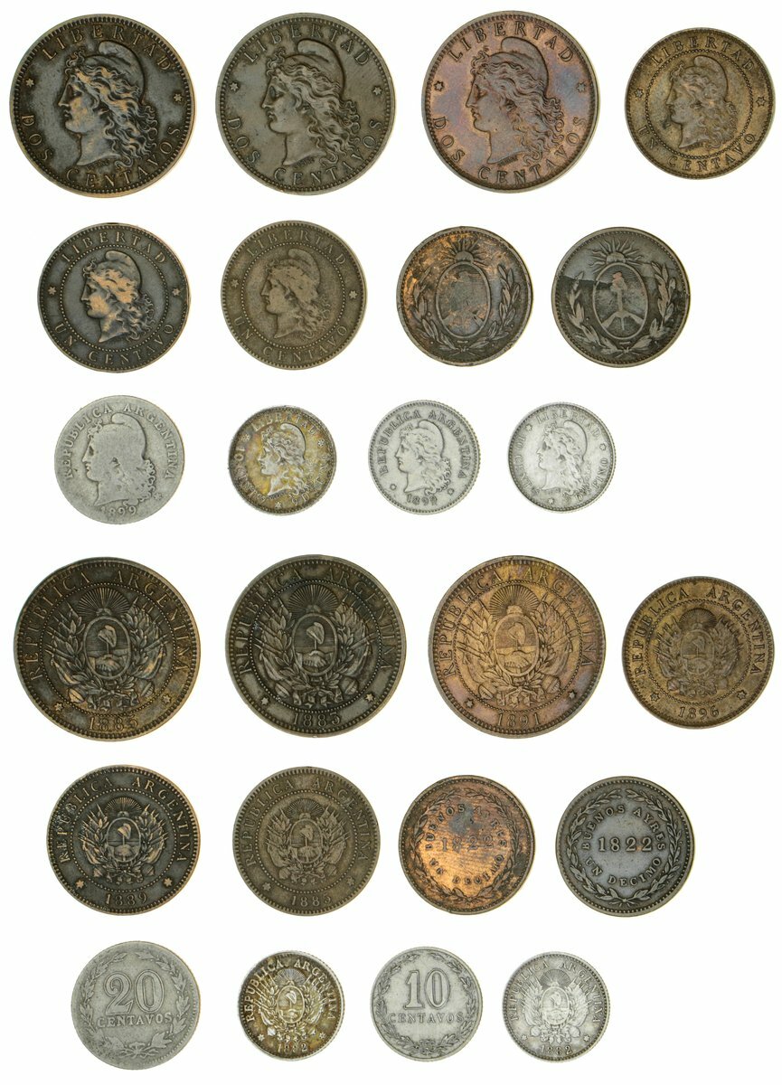 Argentina, Republic [10], 20-Centavos, 1899 (KM 36), fair, the key date; additionally, 10-Centavos [3], 1882 [2], another, 1899 (KM 26; 35), second and third cleaned, the first toned, very fine; also, 2-Centavos [3], 1883; 1885; 1891 (KM 33); Centavos [3], 1885; 1889, 1896 (KM 32), generally fine, the last a key date of series, almost very fine; additionally, Buenos-Aires, Decimos [2]; 1822; 1823 (KM 1), both lightly cleaned, otherwise about fine [12]