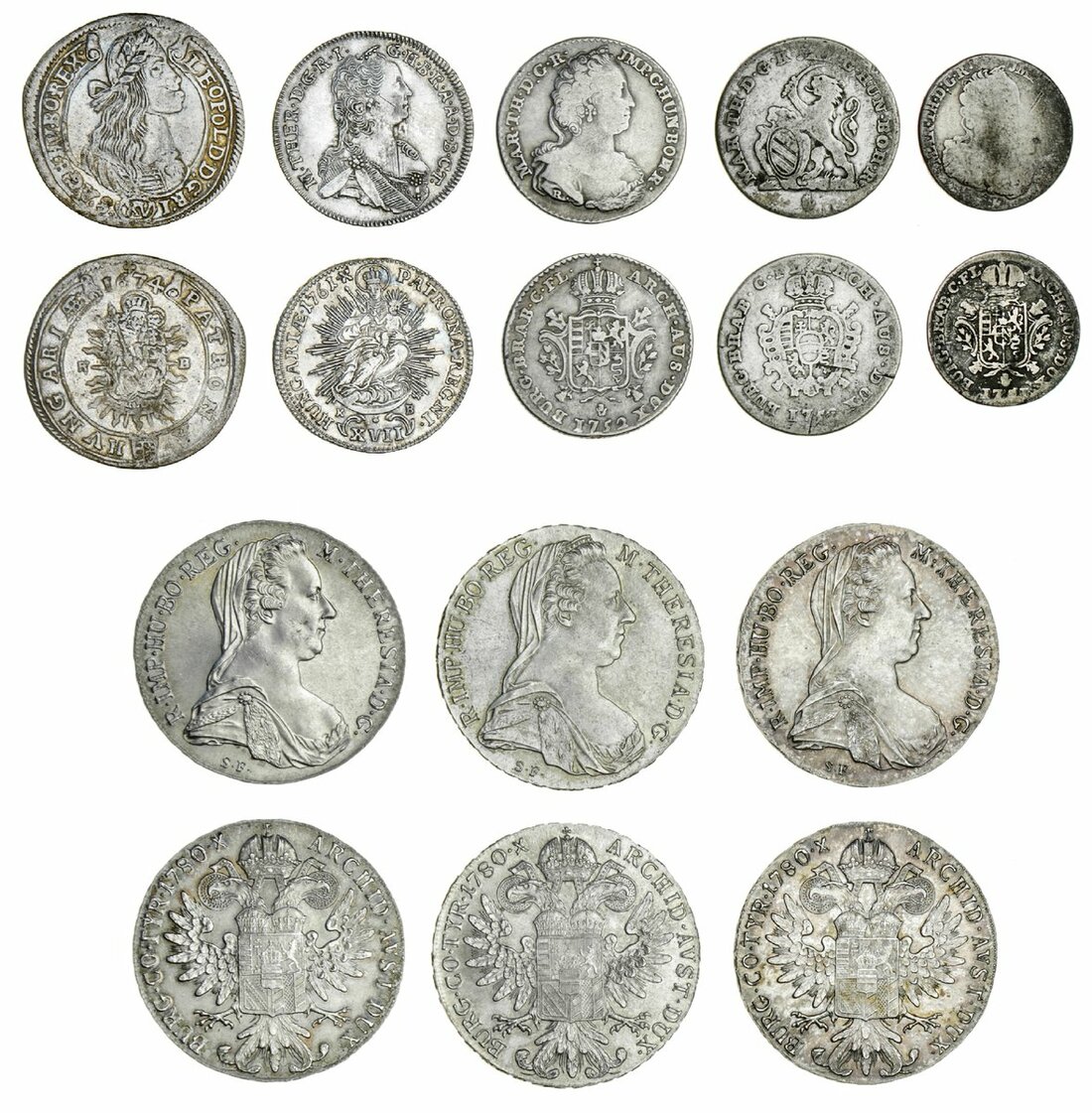 Austria, Habsburg Dynasty, Hungary and the Austrian-Netherlands, including, Leopold I 'Hogmouth' (1658-1705), 15-Krajczar, 1674-KB (KM 175); also, Maria Theresa (1740-80) [7], 17-Krajczar, 1761-KB (KM 356.1); Quarter-Ducaton, 1752 (KM 6); Eighth-Ducaton, 1751 (KM 5), 2-Escalin, 1752, Brabant (KM 16); and, Restrike Thalers (3), '1780' (cf. KM 1866.2), an interesting group, some perhaps once lightly cleaned, otherwise fair to very fine, the last three uncirculated (8)