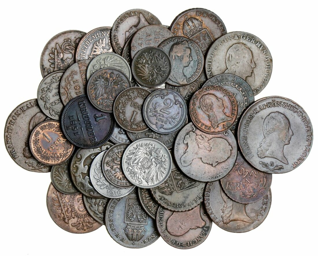 Austria, Habsburg Dynasty, Hungary and the Austrian-Netherlands, copper coins [12], including: Francis II, Kronenthaler, 1794 (KM 62.1); 2-Liards (2-Oorden) (3), 1757; 1777; 1789; 1790; additionally, Liard [2], 1777, 1778; and various others (6); additionally, Austrian Empire [32], including: 30-Kreuzer, 1807-A (KM 2149); 15-Kreuzer, 1807-A (KM 2138); 6-Kreuzer, 1800 (3), A, B, S (KM 2128); 4-Kreuzer (2), 1861-A, 1864-B (KM 2194); 3-Kreuzer (5), 1800 [4], B; C; F; S (KM 2115.3); another, 1851-A (KM 2193); Kreuzer (12), 1760-H; 1761-P; 1800 [2], B; C; 1812 [2], B; S; 1816 [4], A {2}; B {2}; 1851-A [2]; also, 1858-M; 1881; 1885 (KM 2186); Half-Kreuzer [3], 1780-W; 1800-A; 1816-A; 20-Heller (2), 1893; 1915; also, 10-Heller (2), 1896; 1916; also, 2-Heller (2), 1898, 1912; Heller, 1898; 1912; ; some lightly cleaned, otherwise generally very fine (45)