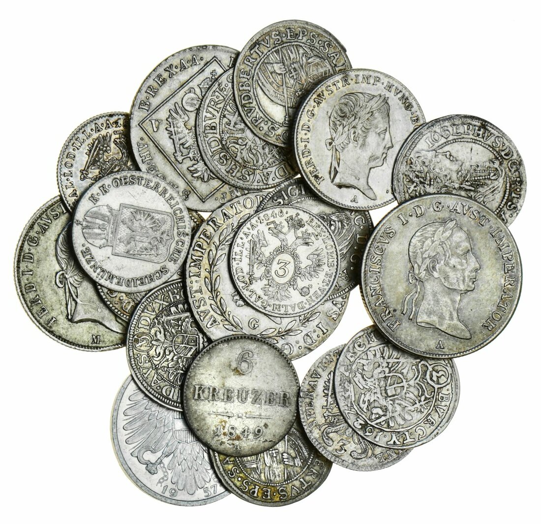 Austrian Empire (1804-67), including: Franz I [2], 20-Kreuzer (KM 2142); 7-Kreutzer (KM 2129); also, Ferdinand I and V of Hungary [11], 20-Kreuzers [5], 1835; 1841; 1843 (KM 2147, 2208); also, 20-Krajczars (2), 1846; 1848 (KM 422); and, 10-Kreuzer (KM 2202); as well as, 10-Krajczar, 1848 (KM 421); additionally, 5-Kreuzer (KM 2196); and, 3-Kreuzer (KM 2191); lastly, Franz Joseph I [5]; Vereinsthaler, 1861-B (KM 2244); Florin, 1860-A, Vienna [2] (KM 2219); Quarter-Florin, 1858-A, Vienna (KM 2213); 6-Kreuzer, 1849-A, Vienna (KM 2200), fine and better;an interesting group, some perhaps once lightly cleaned, otherwise mostly very fine some better still [18]