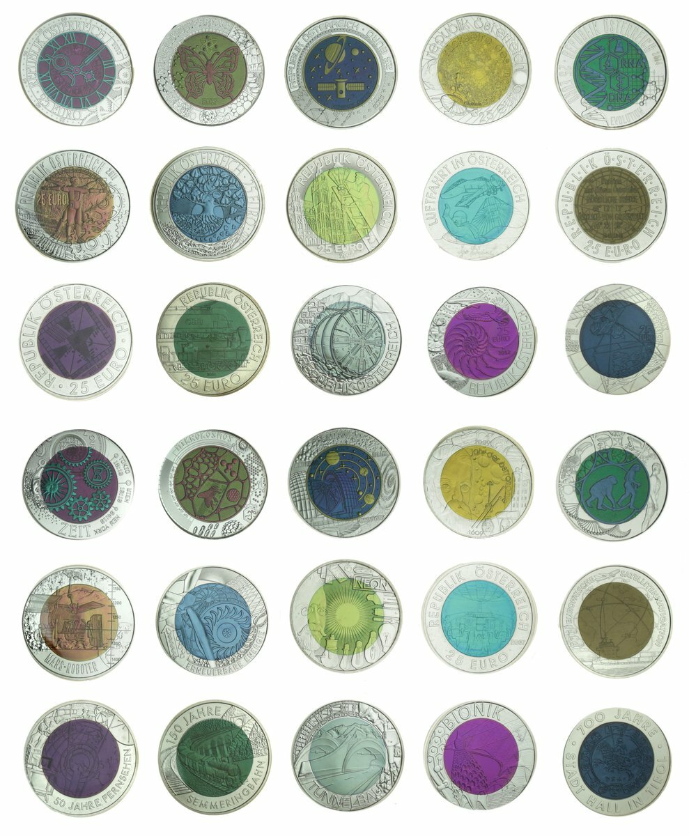 Austria, Republic, Proof 25-Euros, by Austrian Mint, in silver niobium [15], 700 Years of Tyrol Hall, 2003 {20447}; 150 Years of Semmering Railway, 2004 {33751}; 50 Years of Television, 2005 {03705}; European Satellite Navigation, 2006 {55372}; Austrian Air Travel, 2007 {00086}; 'Wonder of Light', 2008 {05962}; International Year of Astronomy, 2009 {16417}; Renewable Energy, 2010 {14656}; Robotics, 2011 {03090}; Bionics, 2012 {51747}; Tunnel Building, 2013 {34668}; Evolution, 2014 {35828}; Cosmology, 2015 {44441}; Time, 2016 {47977}; The Microcosm, 2017 {46359}, all brilliant uncirculated with special niobium colouring, in mint cases of issue [15]
