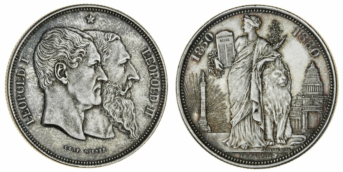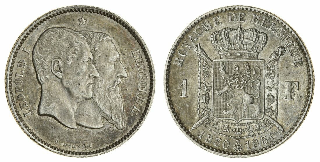 Belgium, Leopold II (1865-1909), 50th Anniversary of Independence, 1830-1880 [2], Commemorative 5-Francs, Brussels (Eyckm-Morin M11a; Dav. 54; KM X8), almost extremely fine, scarce, only 6,714 struck; additionally, Commemorative Franc, as last (KM 38), good very fine or slightly better, a nice pair [2]