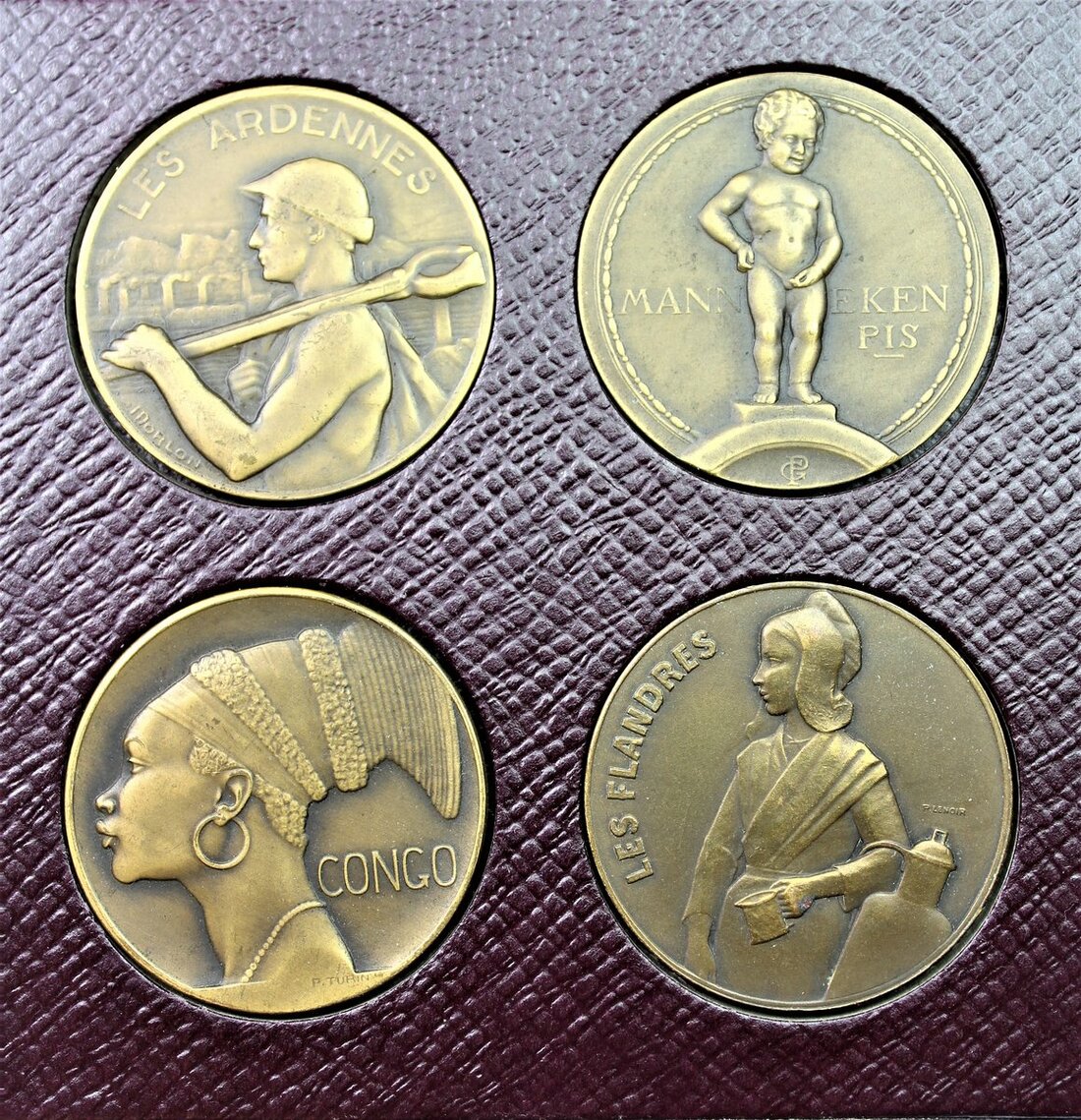 Belgium, Leopold II, gilt AE Medal, 1891, Competition of the European Scientific Society, 71mm, 148.78g, as struck, in case of issue; also, Brussels Exposition, 1935, Set of Æ Medals, 32mm [4], including: 'Les Ardennes'; 'Manneken Pis'; 'Congo' and 'Les Flandres', all 9g, extremely fine or better, both in cases of issue; additionally, uniface Artist's strikings of the same series [4], depicting the obverse and reverses of the 'Congo' and 'Les Flandres' issues, these very fine or better (9)