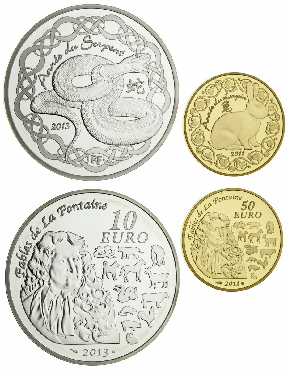 (g) Chinese Year of the Rabbit, 2011, gold Proof 50-Euros, Monnaie de Paris, .920 AV, 8.45g, brilliant uncirculated, rare, only 500 examples struck, in fitted case of issue, with certificate of authenticity no. 325; another, Year of the Serpent, silver Proof 10-Euros, 2013, brilliant uncirculated, in fitted case of issue, with certificate of authenticity no. 00262 [2]