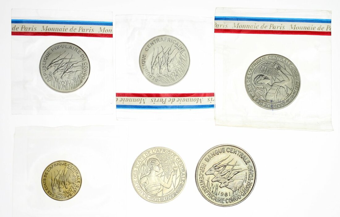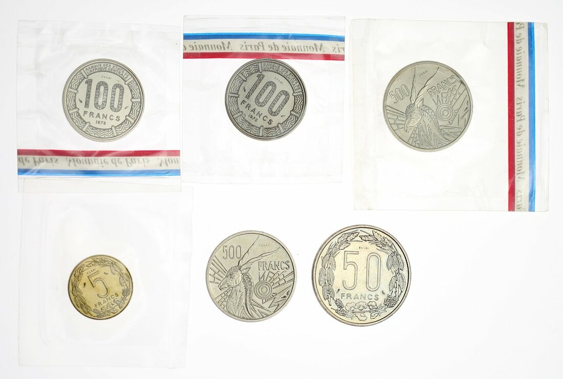 Congo, People's Republic, Essais [2], Pattern 50-Francs, 1961 (KM E1); Pattern 100-Francs, 1975 (KM E3); also, Central African Republic, Pattern 100-Francs, 1975 (KM E4); lastly, Central African States [3], Pattern 500-Francs, 1976 [2] (KM E9); Pattern 5-Francs, 1973 (KM E1), all brilliant uncirculated, in vacupacks of issue [6]