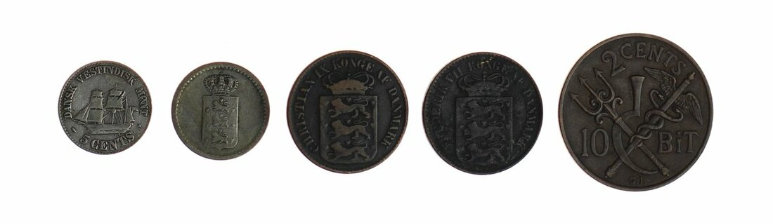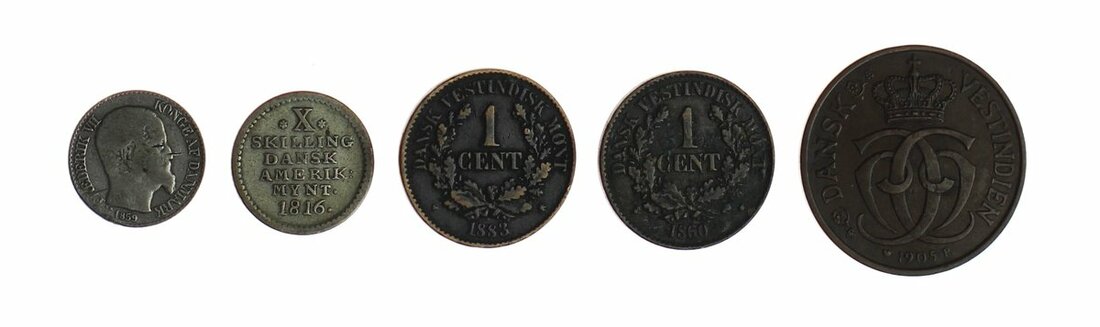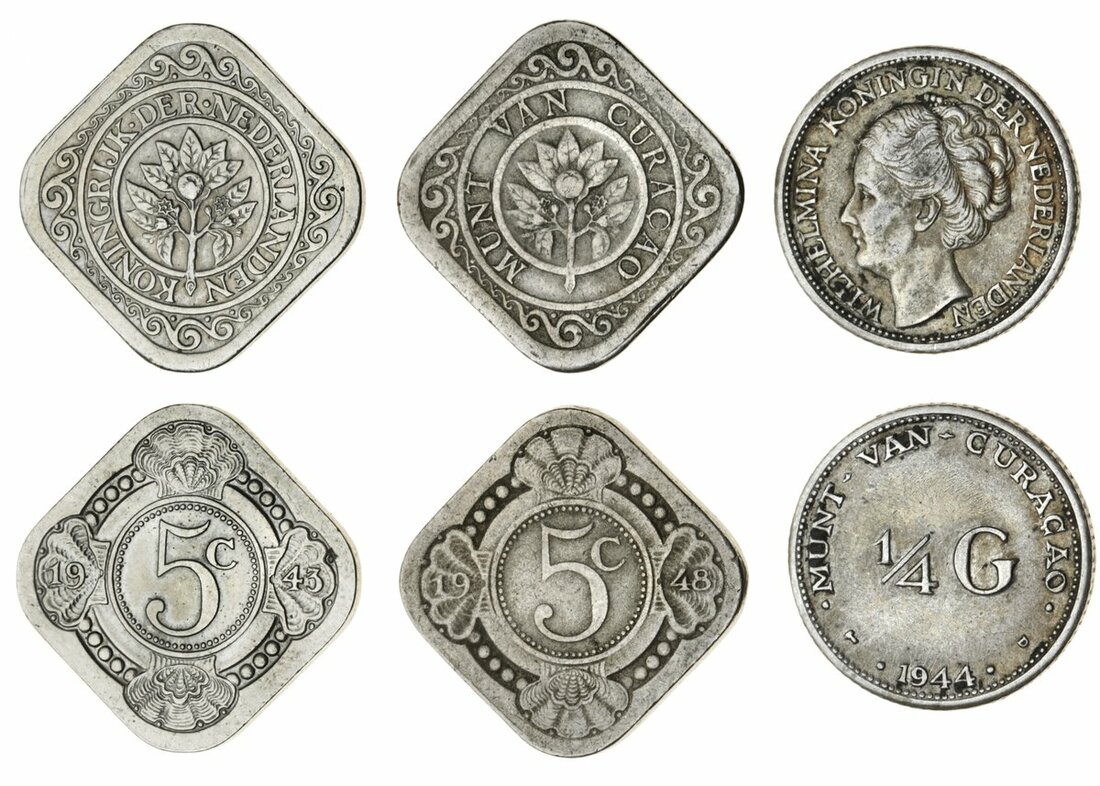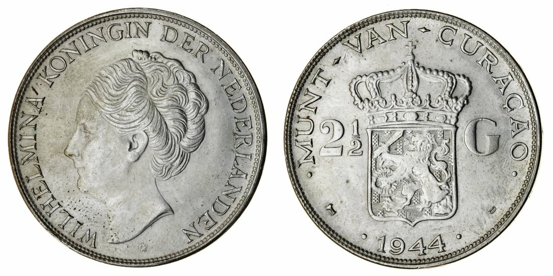 Curaçao, Dutch Antilles, Queen Wilhelmina [4], 2.5 Gulden, 1944-D (KM 46), about mint state, only 200,000 minted of which 60,000 were melted immediately; additionally, Quarter-Gulden, 1944-D (KM 44); also, 5-Cents [2], 1943; 1948 (KM 40, 47), the last cleaned, otherwise fine to almost very fine; additionally, Danish West Indies (5), 10-Skilling, 1816; 5-Cents, 1859; 2-Cents, 1905; lastly, Cents [2], 1860; 1883 (KM 14, 63, 65, 68), good fine to very fine [9]