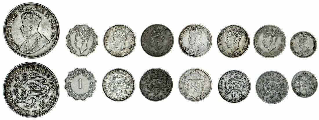 Cyprus, British Protectorate [8], including George V, 45-Piastres, 1928 (KM 19); 9-Piastres, 1921 (KM 13); 4.5-Piastres, 1921 (KM 15); also, George VI, 9-Piastres (2), 1938, 1940 (KM 25); Piastre, 1938 (KM 23); also, Shillings (2), 1947, 1949 (KM 24; KM 31); first extremely fine, others fine or better [8]