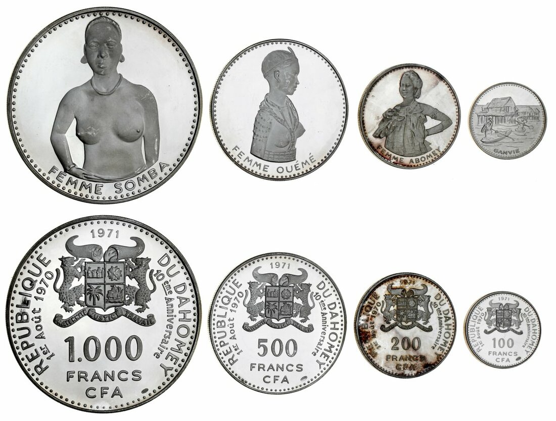 Dahomey, Republic, Proof silver coins [4], 10,000-Francs (KM 4.2); also, 500-Francs (KM 3.2); 200 Francs (KM 2.2); 100 Francs (KM 1.2), light handling marks across otherwise brilliant surfaces, much as struck, a scarce set [4]