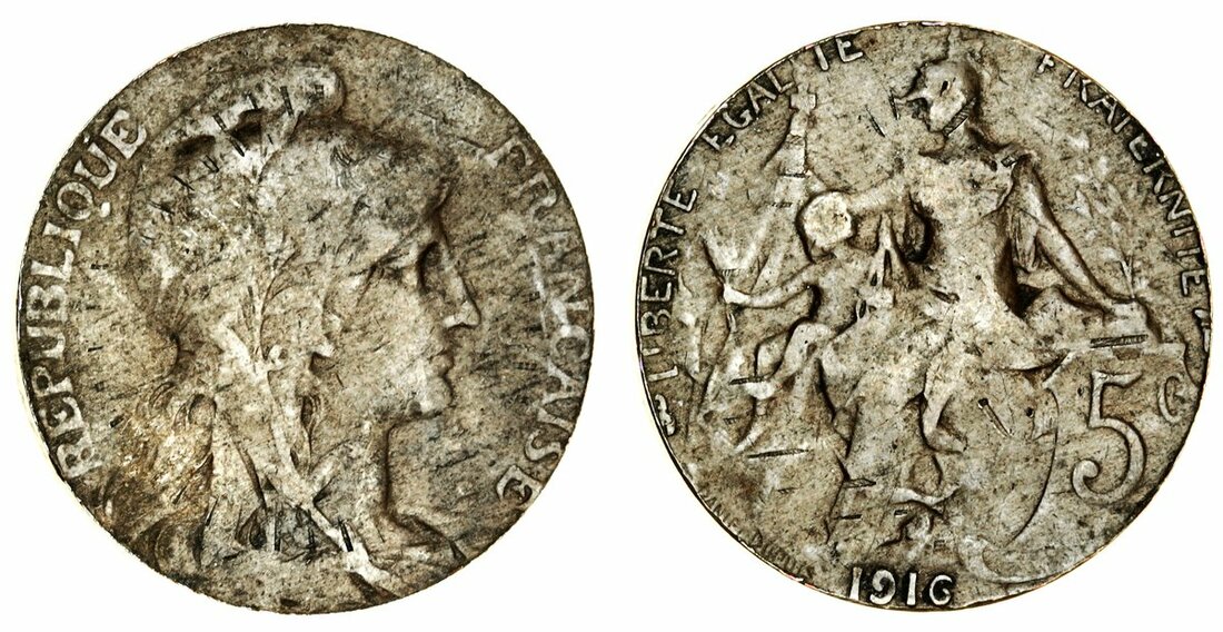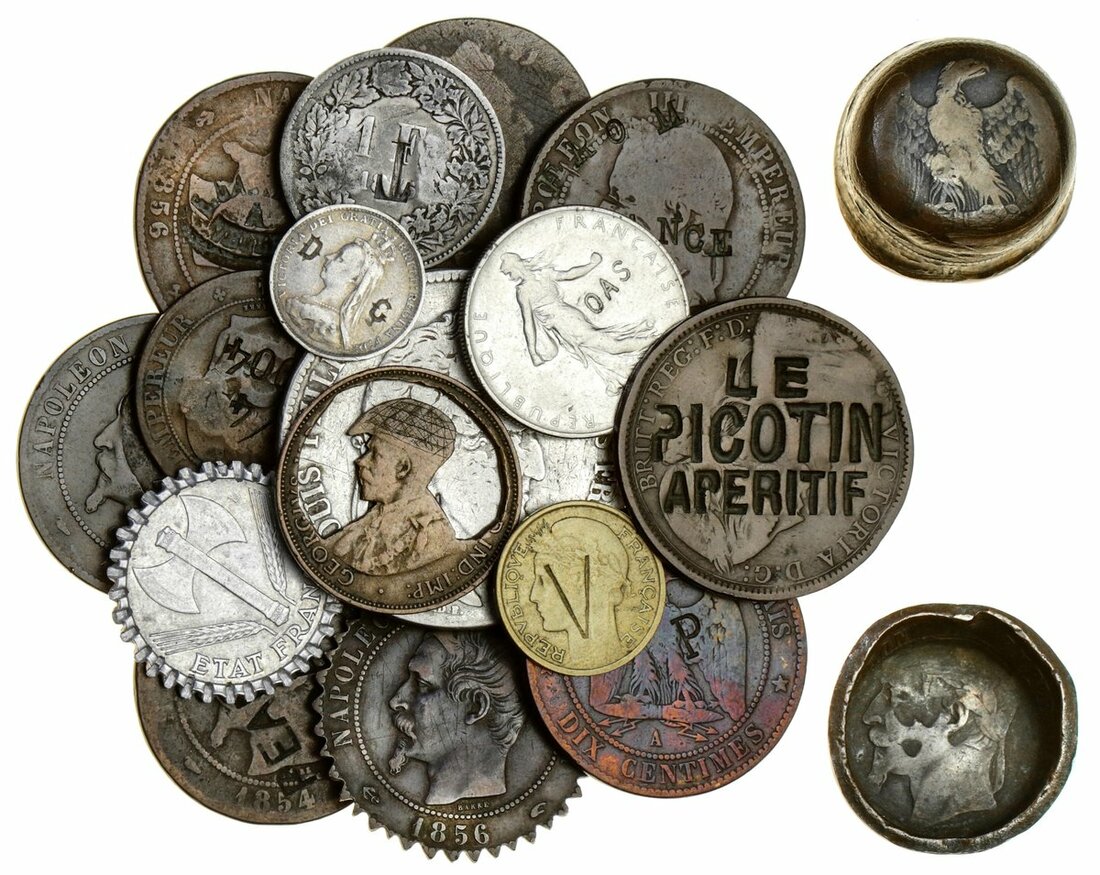 Europe, Countermarked, engraved, and modified Coins and Tokens [18], including, 5-Francs, 1837-A; Swiss Franc, 1875; Victoria, Threepence, 1889; also, Napoleon, 10 Centimes [7], including Pear's Soap, another, "Wm. H. Britton, 1918 // From France"; another, deformed into thimble shape; also, Victoria, Penny, 1874, 'Le Picotin Aperitif'; 5-Centimes, 3/4 1904 / 22/8 1901, counterstamp with JH in lozenge; lastly, modern issues, France [4], 5-Centimes, 1916, on a reduced planchet, fine; and, 50-Centimes, 1940; Vichy Franc, 1942; another, Franc, 1960, marked OAS; lastly, Jersey, Halfpenny, variable grades, as illustrated (18)