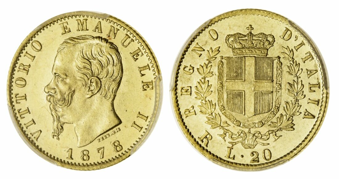 (g) Italy, Unified Kingdom, Vittorio Emanuele II (1861-78), gold 20-Lire, 1878-R, Rome (Pag. 475; Fb 12; KM 10.2), flashy proof-like surfaces, in PCGS holder, graded MS63PL