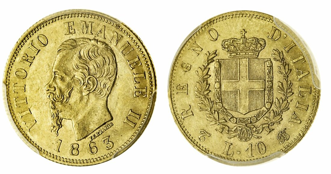 (g) Italy, Unified Kingdom, Vittorio Emanuele II (1861-78), gold 10-Lire, 1863-T, Turin (Pag. 479; Fb 15; KM 9.2), in PCGS holder, graded AU58