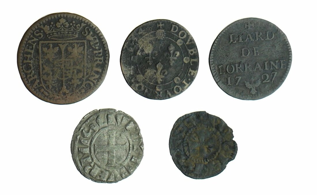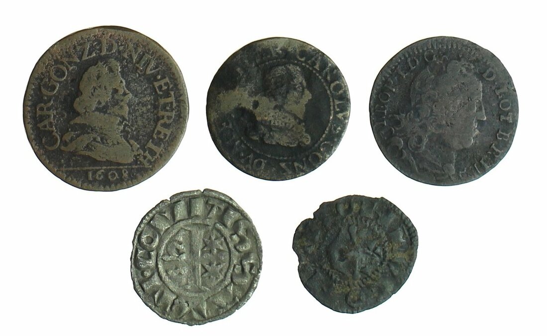 France, Provincial Coinage, Nevers, a group of AR and AEs, 13th-17th century, including Manaut II, widow of Guy II (1241-1257), AR Denier, 0.75g (Duplessy 762), about fine - the rest of the group good to fair. (5)
