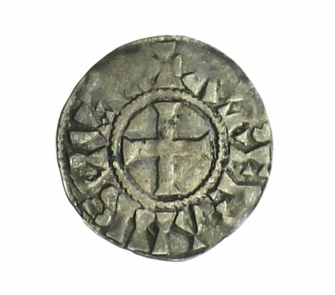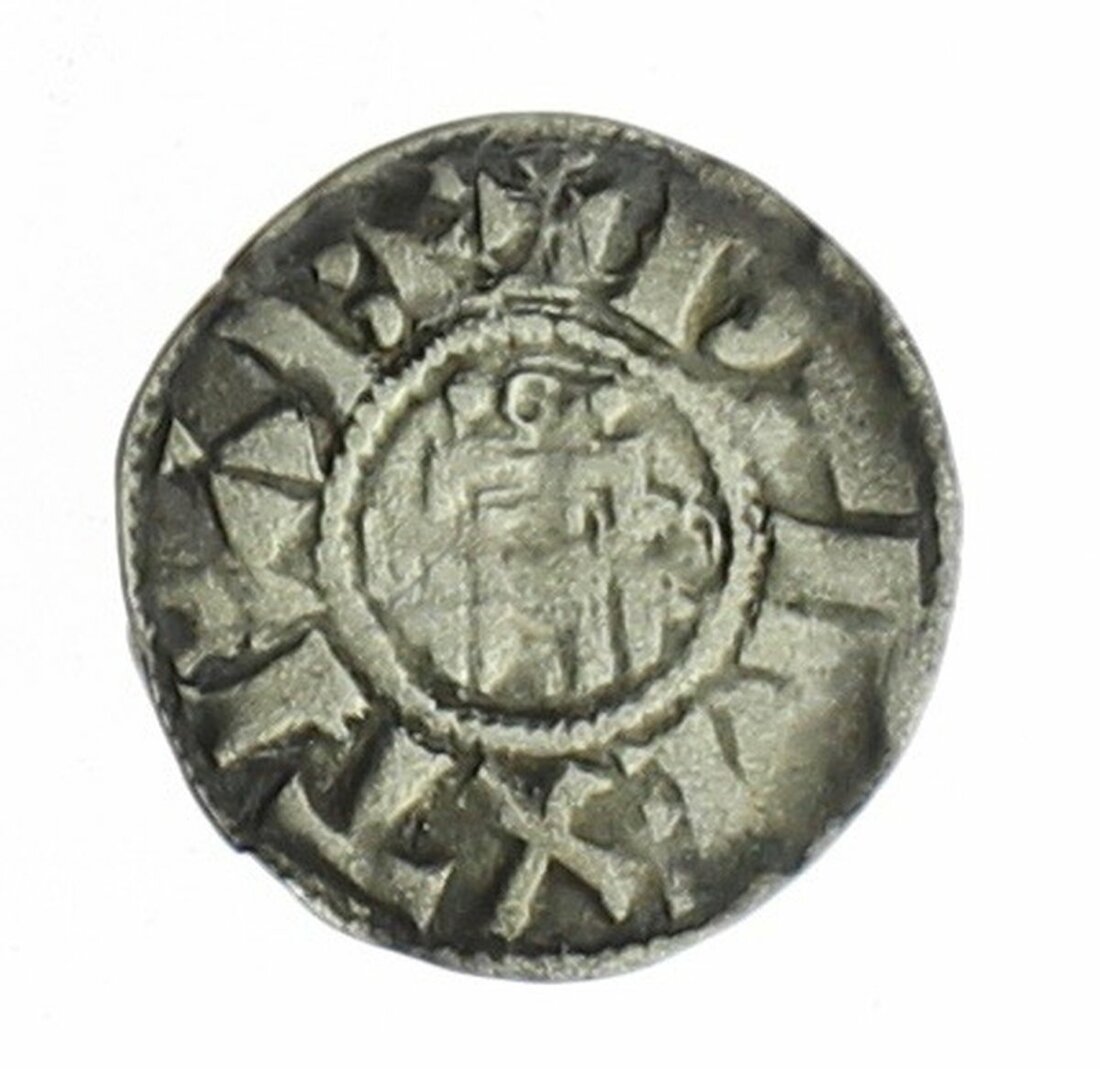 France, Provincial Coinage, Viscount or Bishop of Orleans, AR Denier in the name of Hugh of France (1010-1025), port of the city, rev. cross, 1.27g (Duplessy 522), about fine/fine with a few spots of verdigris, uncommon