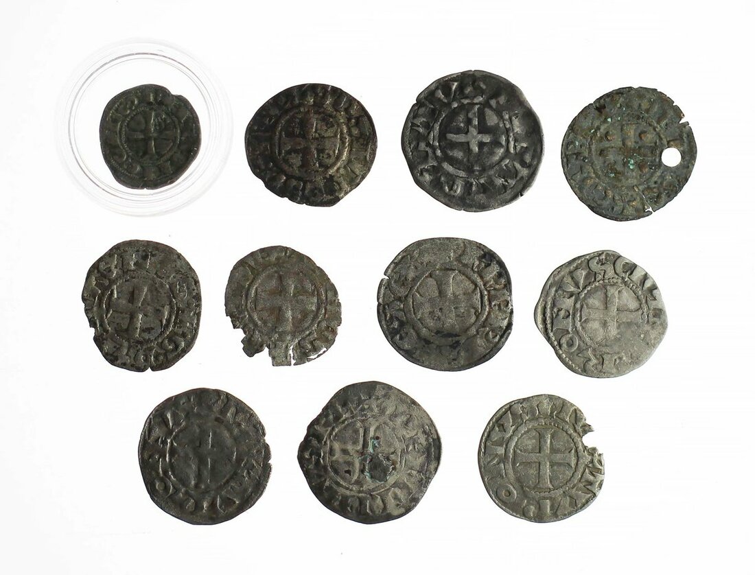 France, Provincial Coinage, Toullouse, Bishopric, Raymond V to Raymond VII (1148-1249), Obol, 0.53g (Boudaeu 722), flan flaw at rim, otherwise fine; with ten Deniers, . (11)
