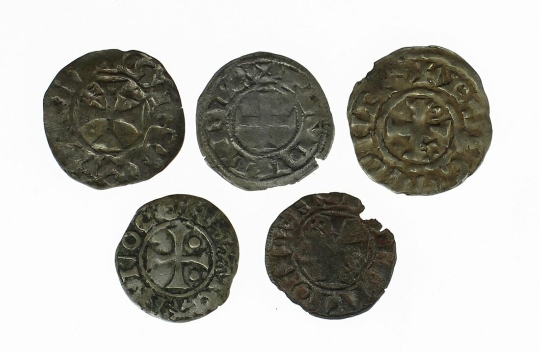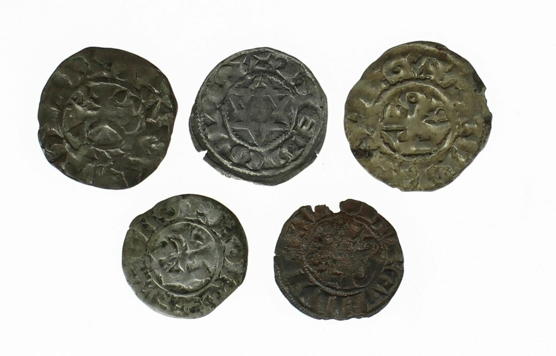 France, Provincial Coinage, a group of five AR Deniers, 12th-14th century, Anjou, Angers(2), Bretagne, Chateauroux, and Bourgogne, fair to fine, Bourgogne chipped.(5)
