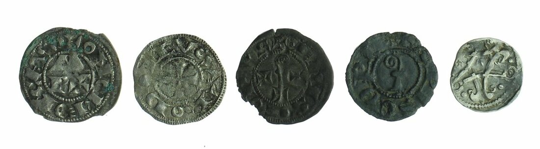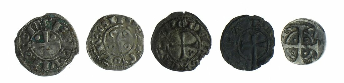 France, Provincial Coinage, a group of four AR obols, Angolueme, 13th century (PdA 2662); Languedoc, Bishopric of Vivier, Aimar (1252-1256) (PdA 3865); Languedoc, bishopric of Cahors, Willaim de Cardaillac (1208-1234) (PdA 3907); Bearn, 13th century (PdA 3295); also Flanders, Lille, AR Petit Denier, ca. 13th century (PdA 6954), all around fine(5)