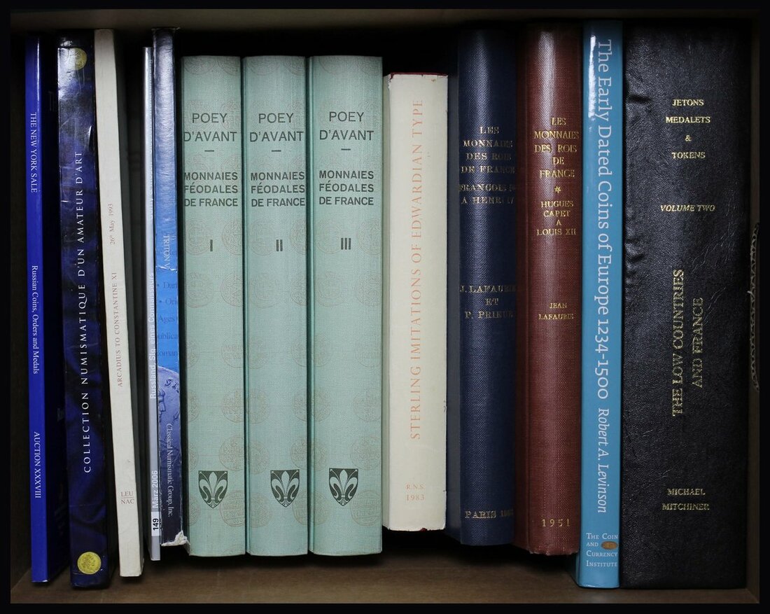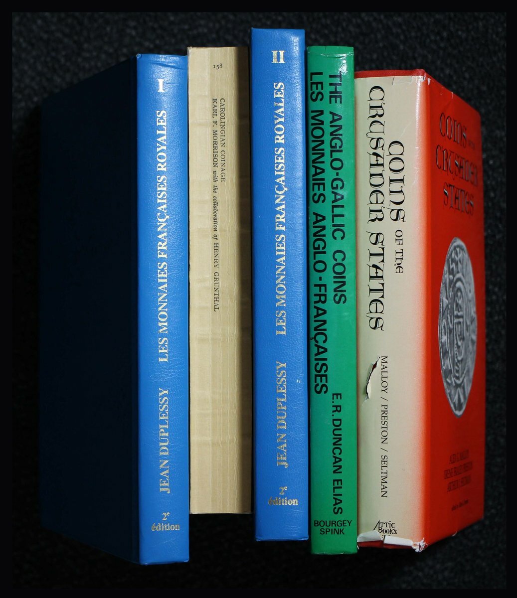 Numismatic litterature, Duplessy, Les Monnaies Francais Royales I & II, Paris 1999; Poey D'Avant, Monnaies Feodales de France I-III, Graz 1961; Malloy et. al., Coins of the Crusader States, New York 1994; Levinson, The Early Dated Coins of Europe 1234-1500, Clifton 2007; Michiner, Jetons, Medalets & Tokens vol. two, The Low Countries and France, London 1991; Morrison, Carolingian Coinage - Numismatic Notes and Monographs No. 158, New York 1967; Mayhew, Sterling Imitations of Edwardian Type, London 1983; Duncan Elias, The Anglo-Gallic Coins, London 1984; Lafaurie, Les Monnaies des Rois de France I-II, Paris 1951,1956; with various sales catalogues and books. (18)