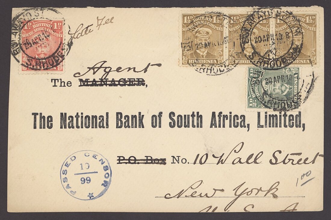 1919 (10 Apr.) National Bank of South Africa envelope to New York, bearing ½d. green, 1½d. brown strip of three and with 1d. red for Late Fee affixed at upper left, all tied by