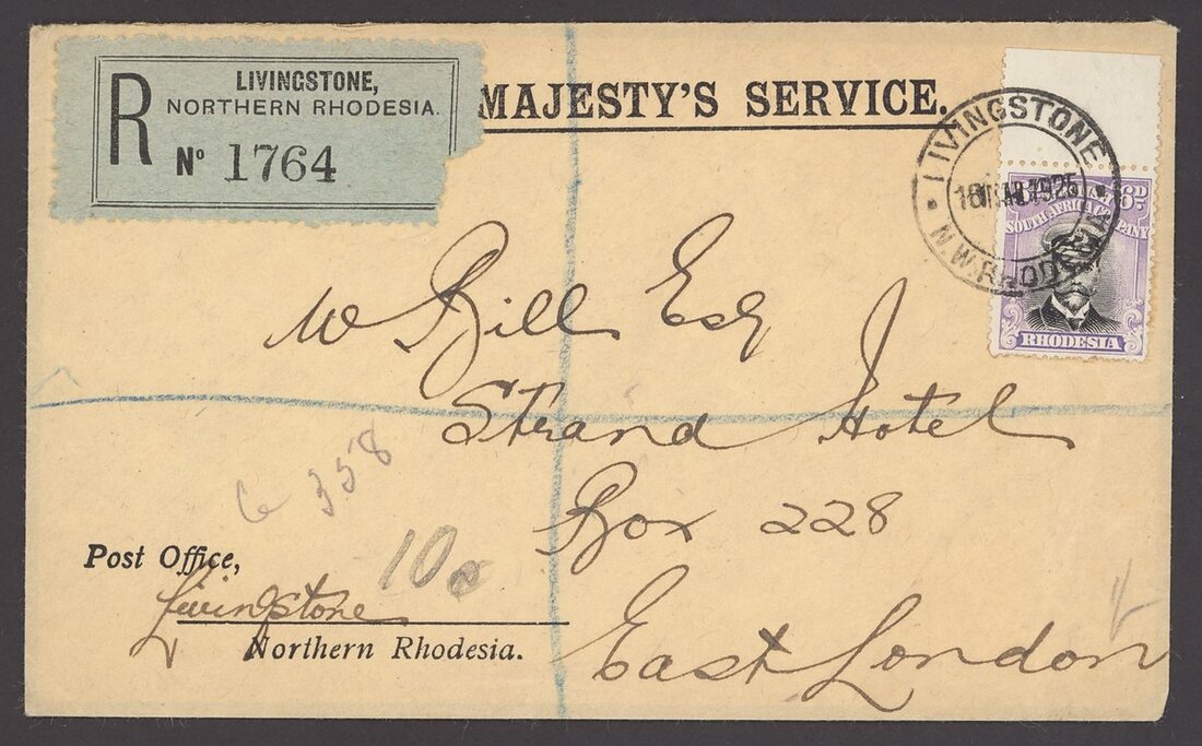 1920 (18 Mar.) O.H.M.S. envelope registered to East London with green registration label '1764', bearing marginal Die IIIB 6d. jet-black and lilac tied by